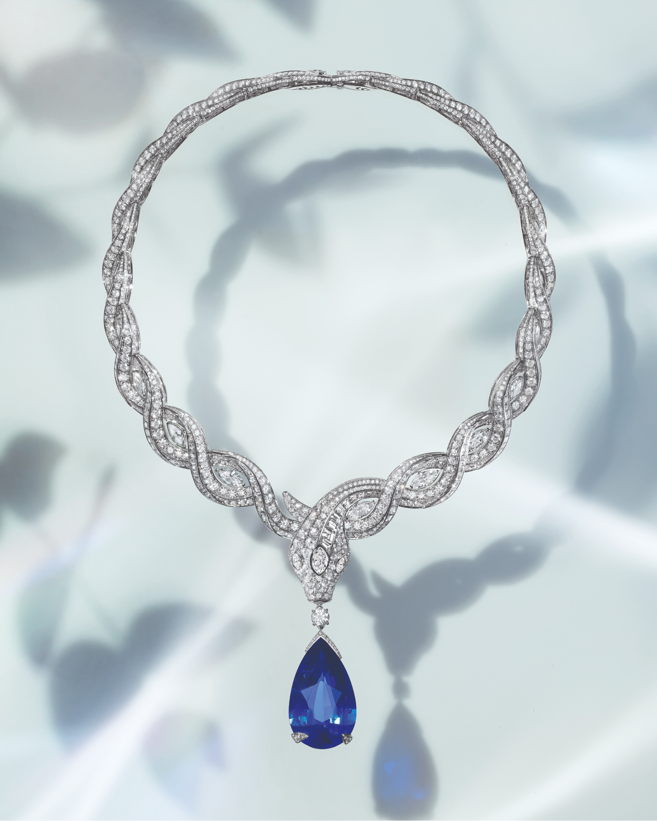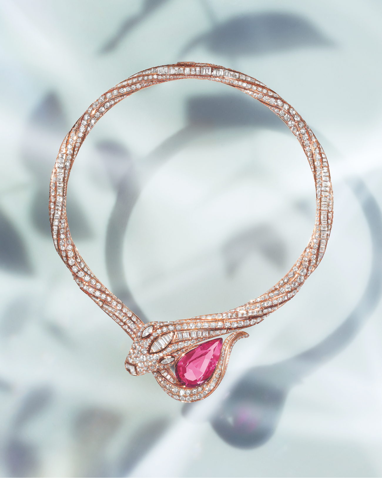 В коллекции также можно найти колье Serpenti Spinel Embrace. Змея из розового золота и бриллиантов обвивается вокруг каплевидной розовой шпинели весом в 25,70 карата, найденной в Таджикистане. В другом ожерелье Serpenti Ocean Treasure — две змеи из платины и бриллиантов сливаются в одну. В центре крутящегося механизма находится шри-ланкийский сапфир каплевидной формы весом 61,30 карата.