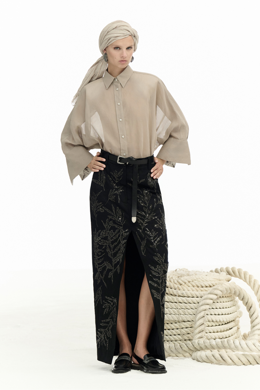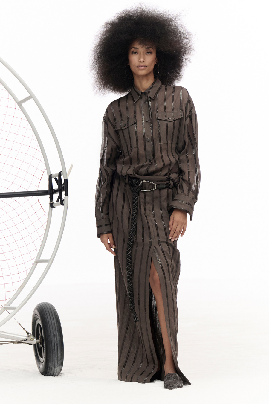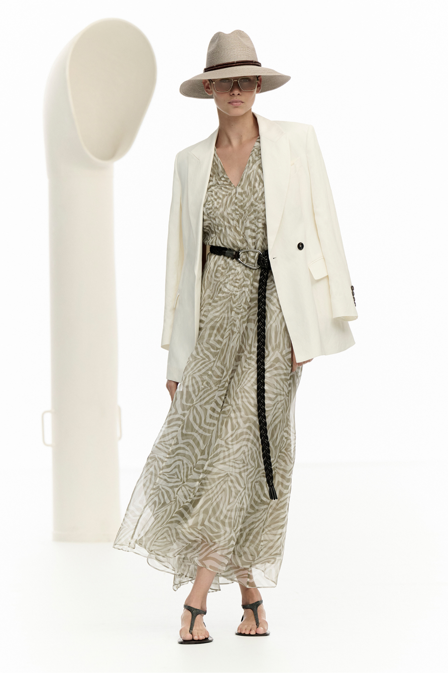 При создании линии Брунелло Кучинелли вдохновлялся путешествиями и красотой природы. В нее вошли удобные хлопковые платья, брючные костюмы в морском синем, карго, топы, юбки и замшевые куртки. Из обуви — вьетнамки, декорированные бусинами, и комфортные мюли. Дополнять образы дизайнер предлагает сумками, например клатчами с бахромой, очками, шляпами и чалмой. В рамках мероприятия также презентовали новую коллекцию ароматов.