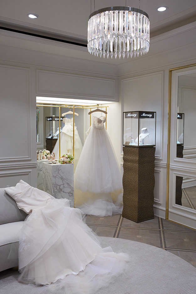Подобрать свадебное платье, костюм жениха, а также наряды для родителей и других гостей свадьбы можно в основном пространстве Wedding by Mercury в Барвихе. Список брендов внушительный: Vera Wang, Elie Saab, Oscar de la Renta, Zuhair Murad, Carolina Herrera, Ines Di Santo, Monique Lhuillier, Marchesa, Inbal Dror; также представлены аксессуары Philip Treacy и Jennifer Behr. Кроме этого, в свадебный бутик эсклюзивно привезли бренд фаты HOMA.