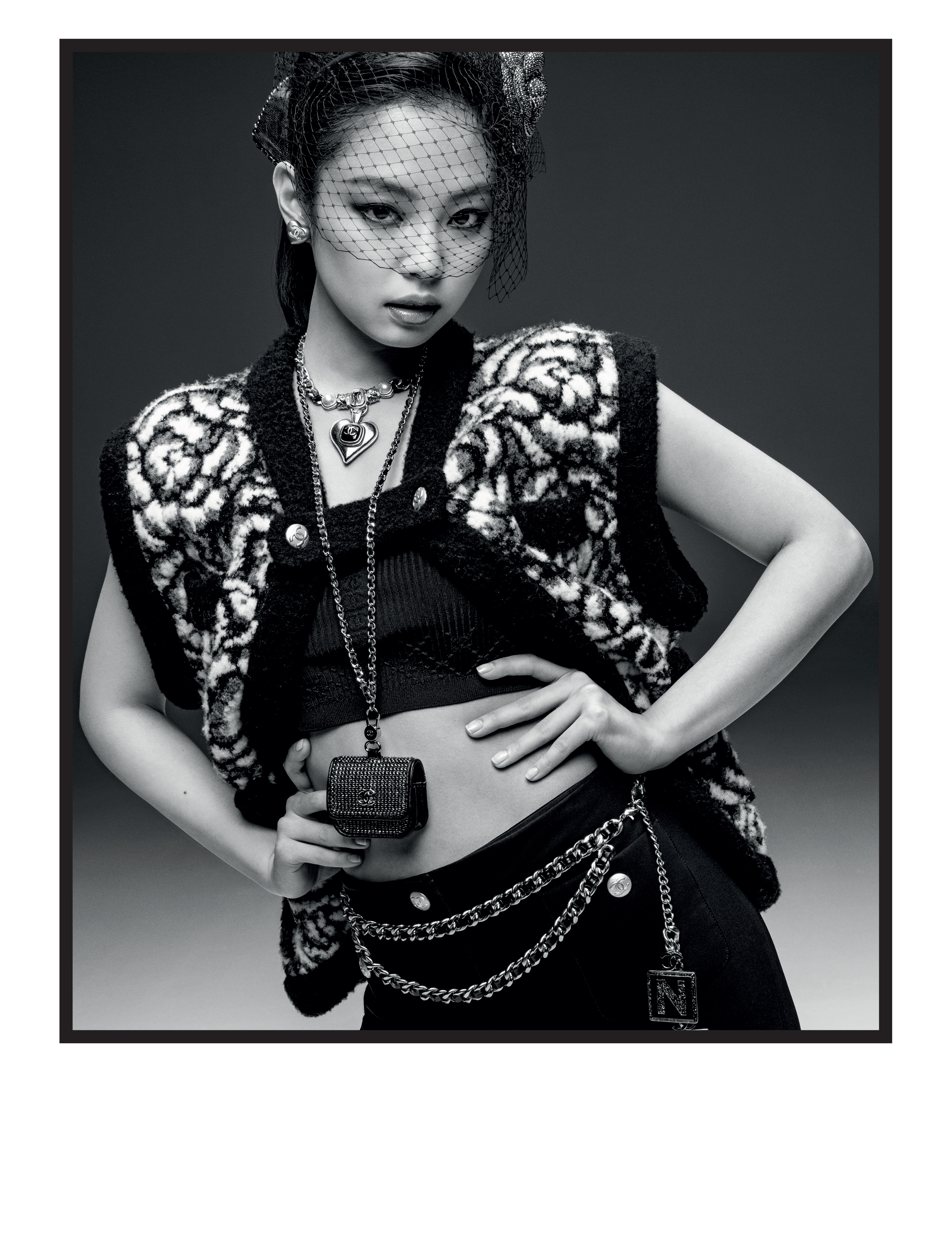 Над снимками работали известные фотографы Инез ван Ламсвеерде и Винуд Матадин. Для съемки Дженни примерила розовый комплект от Chanel, длинный серый пуховик, белый комбинезон и несколько моделей свитеров. Образы дополнили фирменными цепочками для тела, ожерельем и микросумками.