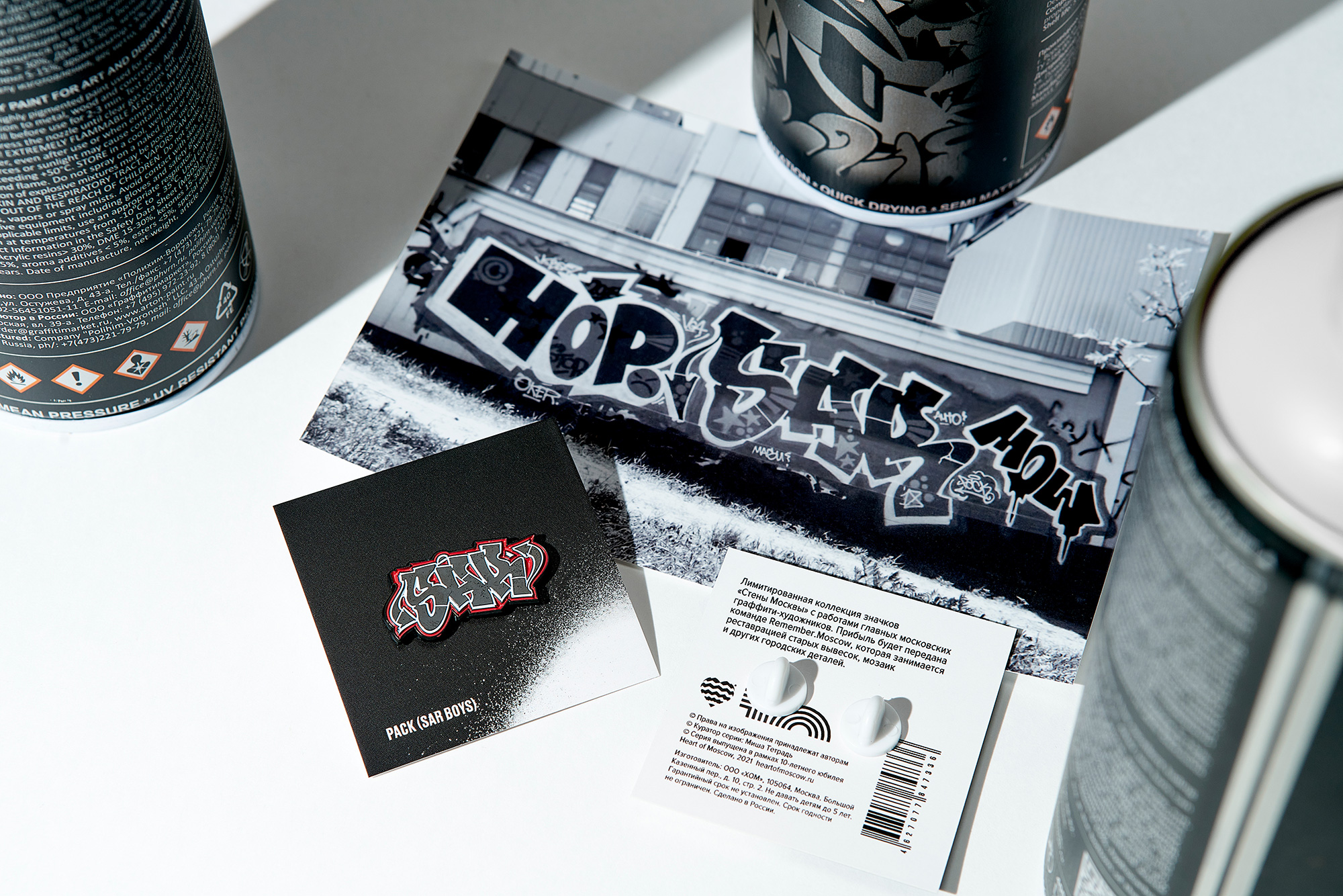 В честь своего десятилетия бренд Heart of Moscow выпустил 11 значков с работами ведущих московских граффити-художников и команд. Среди них — Кирилл Лебедев, Миша Most, Паша 183, Sneksy, SAR Boys, ИСК и многие другие.