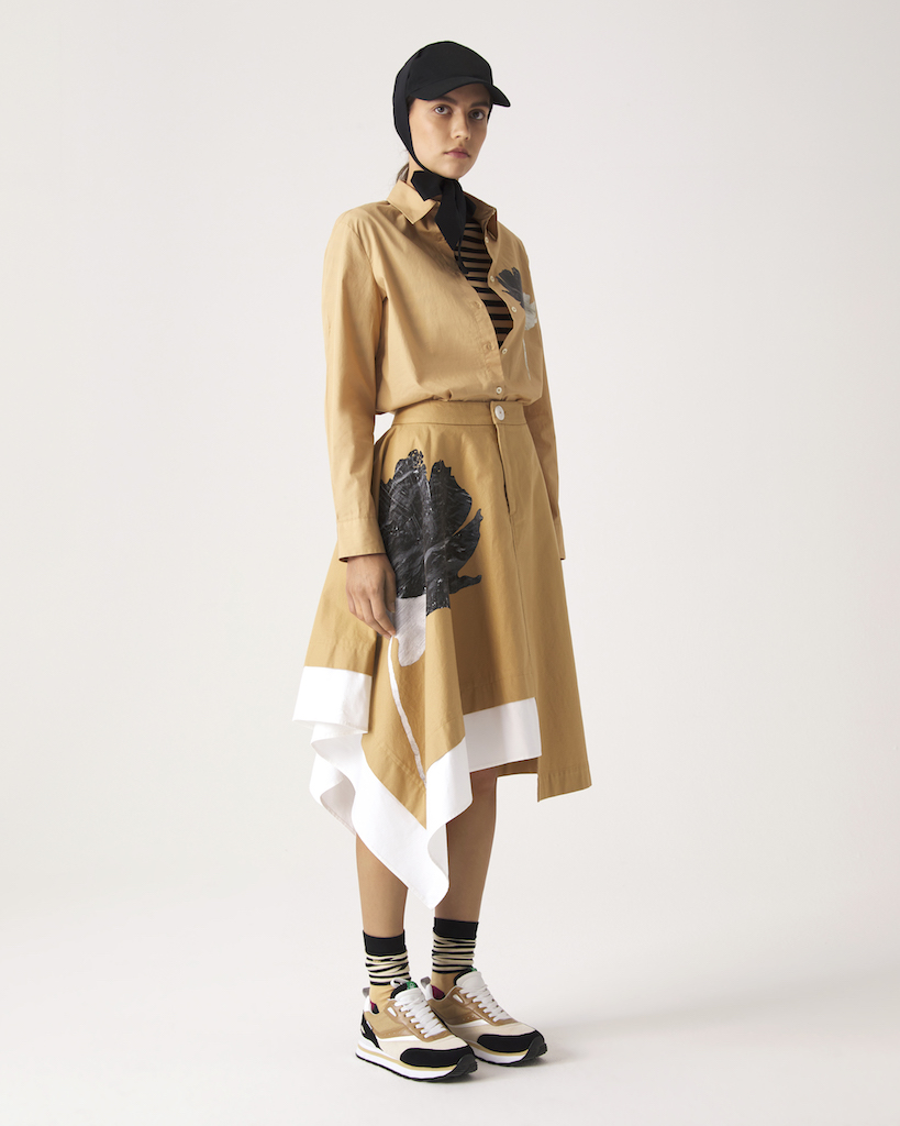 В капсулу вошли футболки и рубашки с цветочными принтами-оттисками, платья, свитеры с надписями и стилизованными изображениями лиц, асимметричные юбки, свободные брюки, легкие пальто и плащи с множеством необычных деталей. Натуральные материалы, такие как хлопок и шерсть, призваны подчеркнуть важность заботы об окружающей среде.