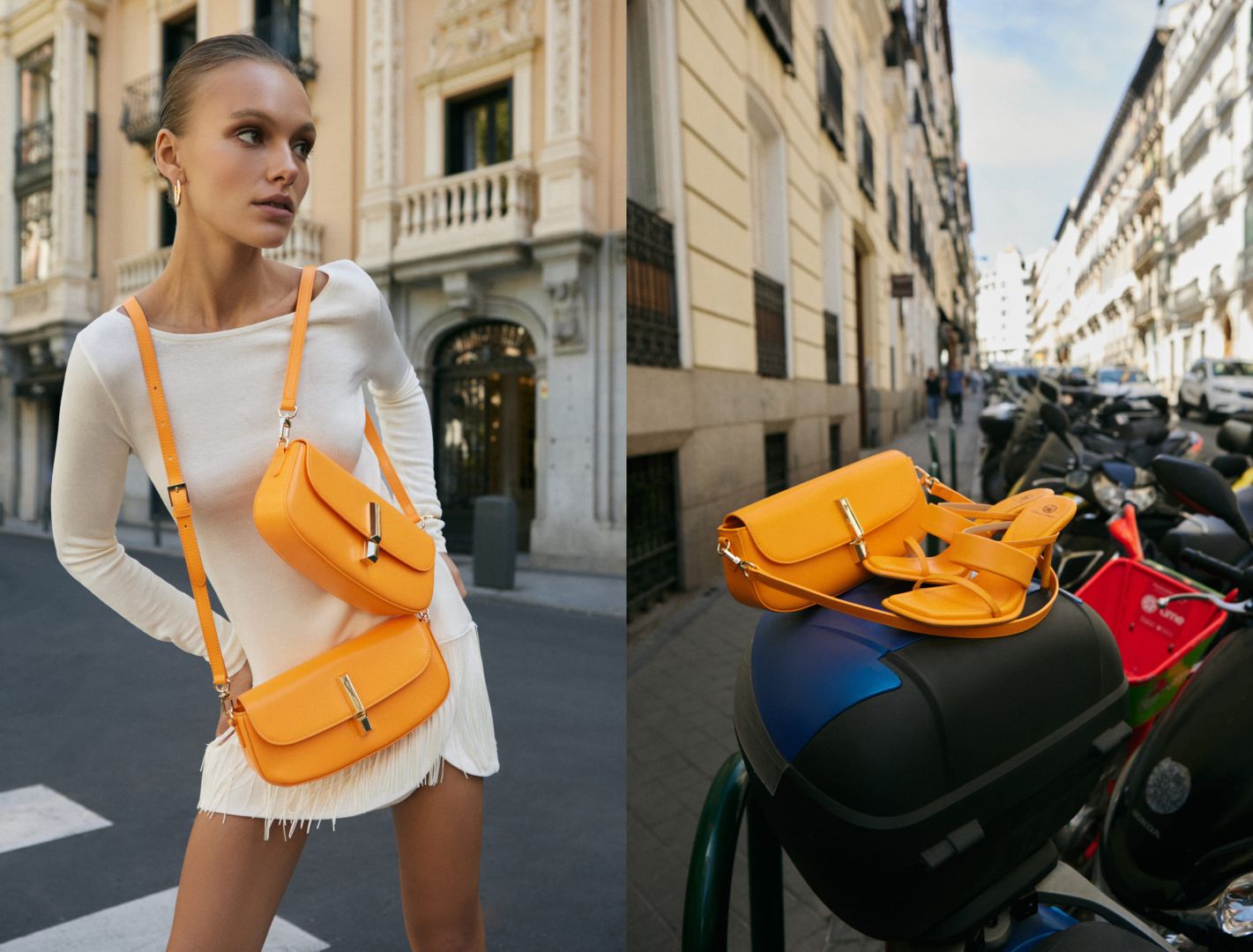 В коллекции представлены туфли, слингбэги, лоферы, босоножки и мюли, к которым можно подобрать универсальные сумки. Цветовая концепция основана на двух вневременных цветах: черном и бежевом, к которым добавили яркий оранжевый.