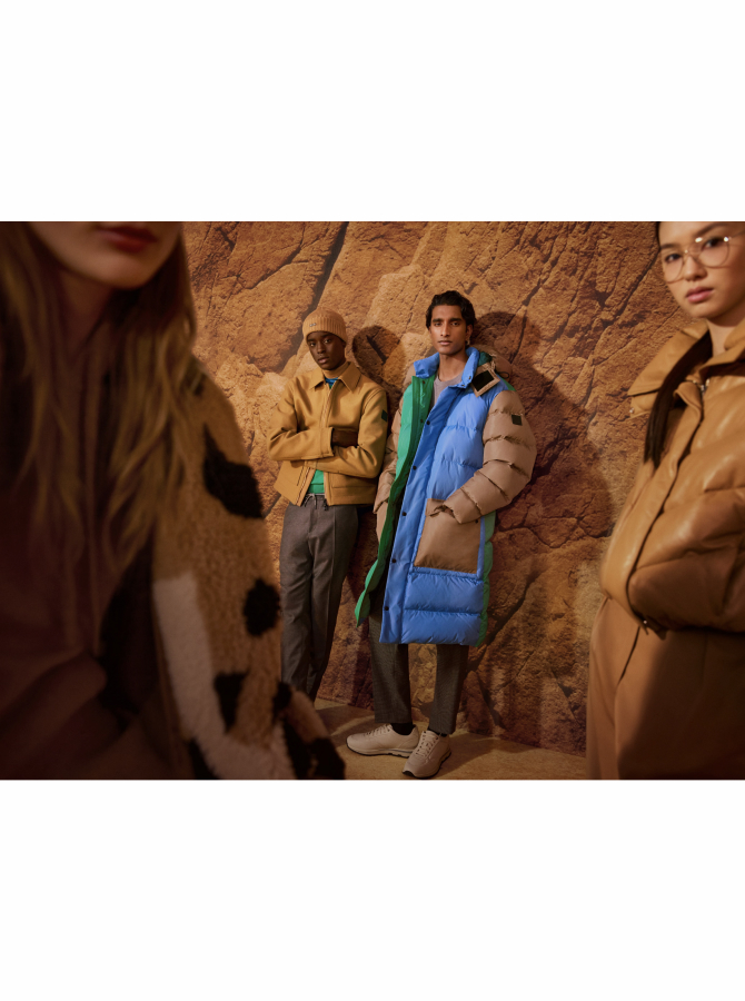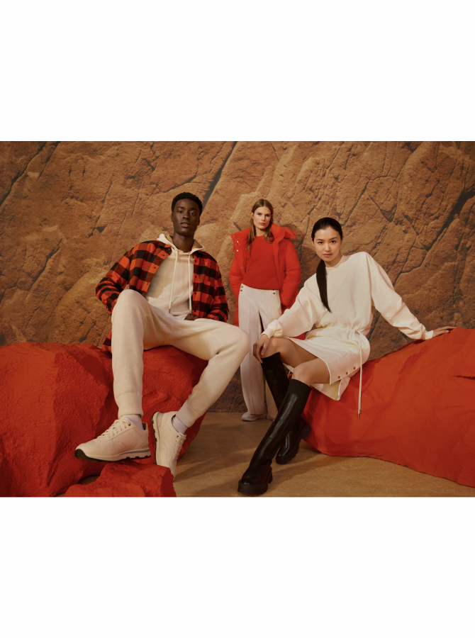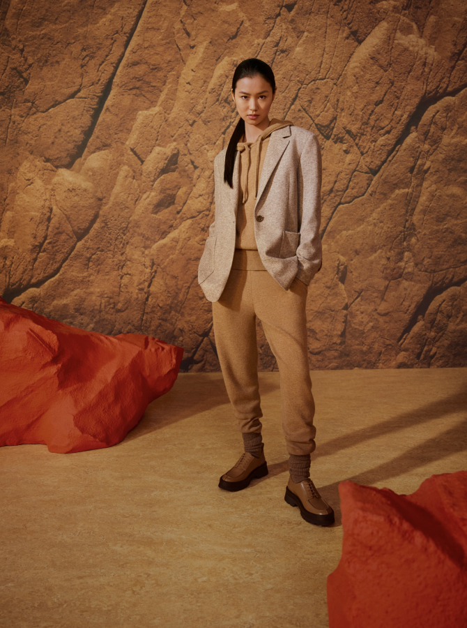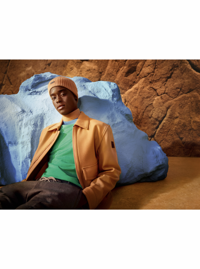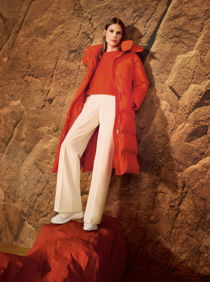 В коллекцию вошли шерстяные свитеры, хлопковые худи, длинные трикотажные платья, свободные брюки, объемные шарфы, шапки-бини и бейсболки с узнаваемым логотипом Boss, вместительные сумки, короткие куртки, пальто и пуховики. Черный, белый, серый и бежевый цвета сочетаются с темно-синим, голубым, ярко-зеленым, красно-оранжевым и лимонно-желтым.