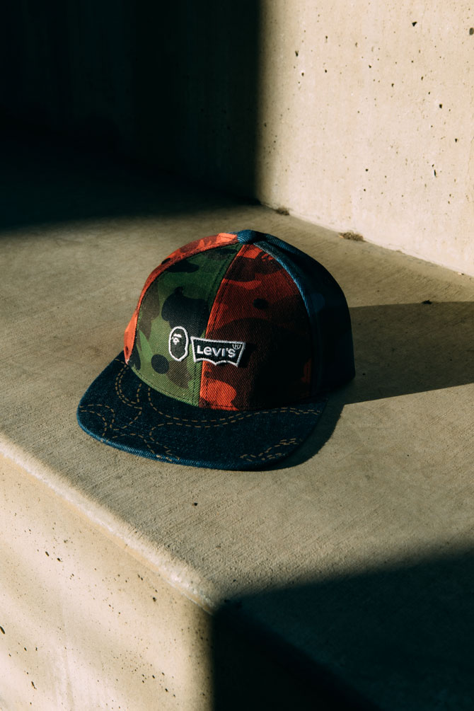 В эксклюзивную коллекцию Levi’s x Bape войдет куртка из денима, джинсы Levi’s 501’93, рубашка Western Shirt, кепка 6-Panel Cap и базовые футболки с логотипом брендов.