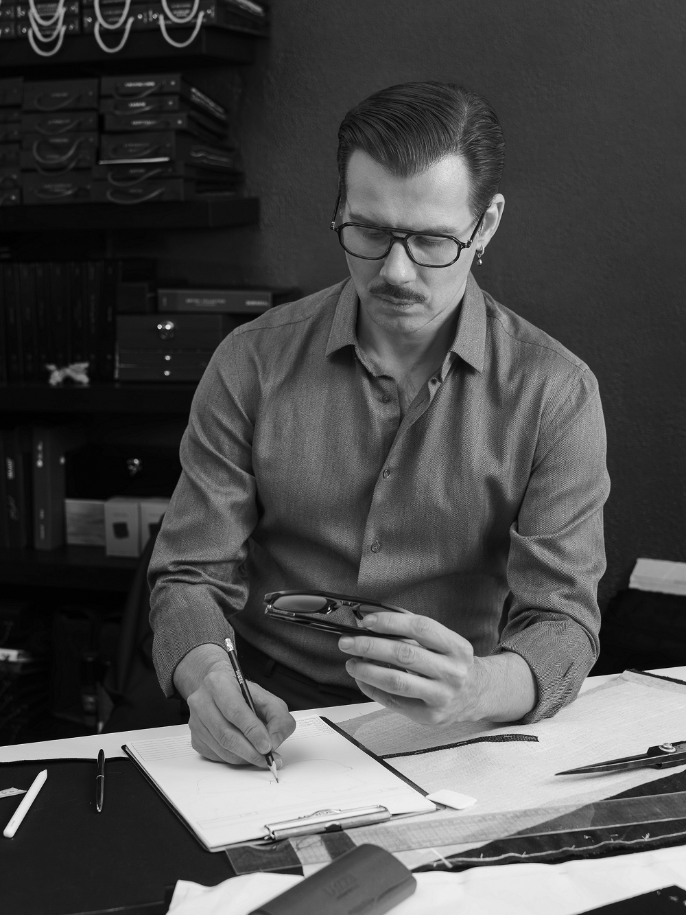 «Я сам фанат очков. В моей личной коллекции более 50 пар. У меня уже был опыт работы с оправами — это были очки из дерева, созданные по моим эскизам», — комментирует Дмитрий.