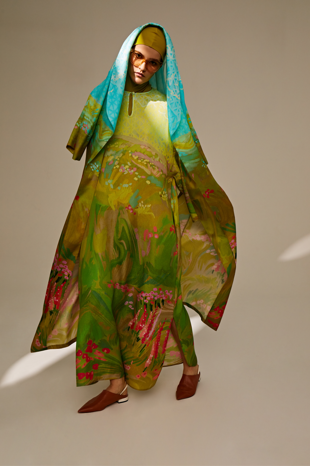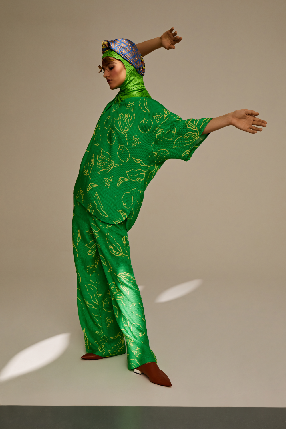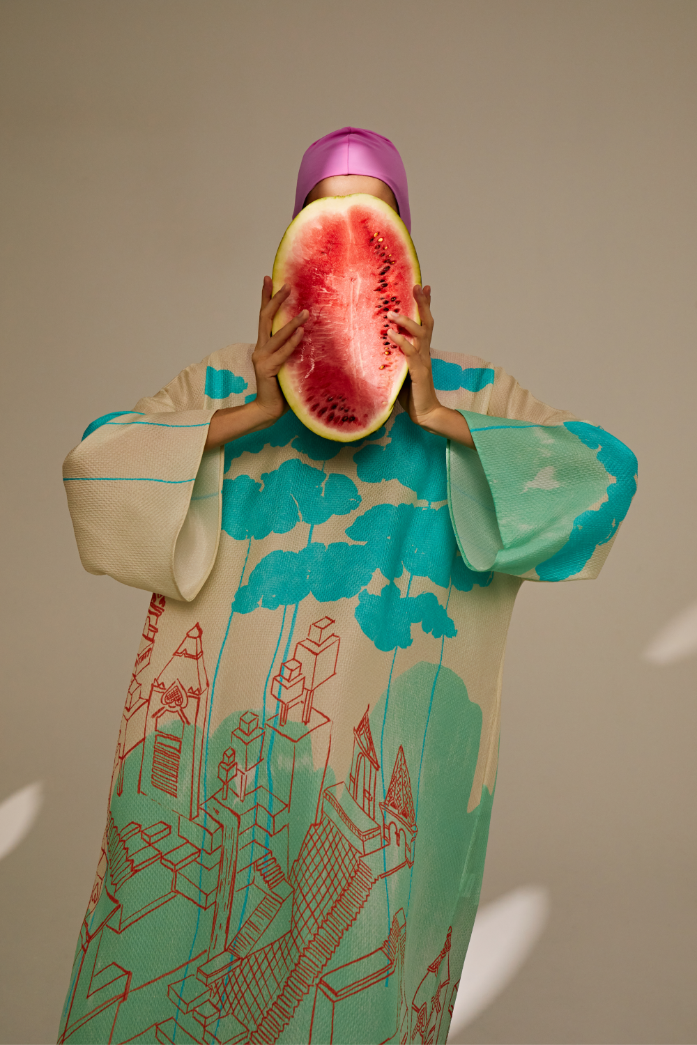 Принты вдохновлены историей о сказочном путешествии через леса, наполненные чудесными растениями, и города с волшебными теремами. Они выполнены в манере живописи импрессионистов и дополнены элементами современной графики, стилизованной под компьютерную. Цветы, фрукты и сказочные пейзажи нарисованы вручную кисточкой, а затем оцифрованы и напечатаны на ткани.