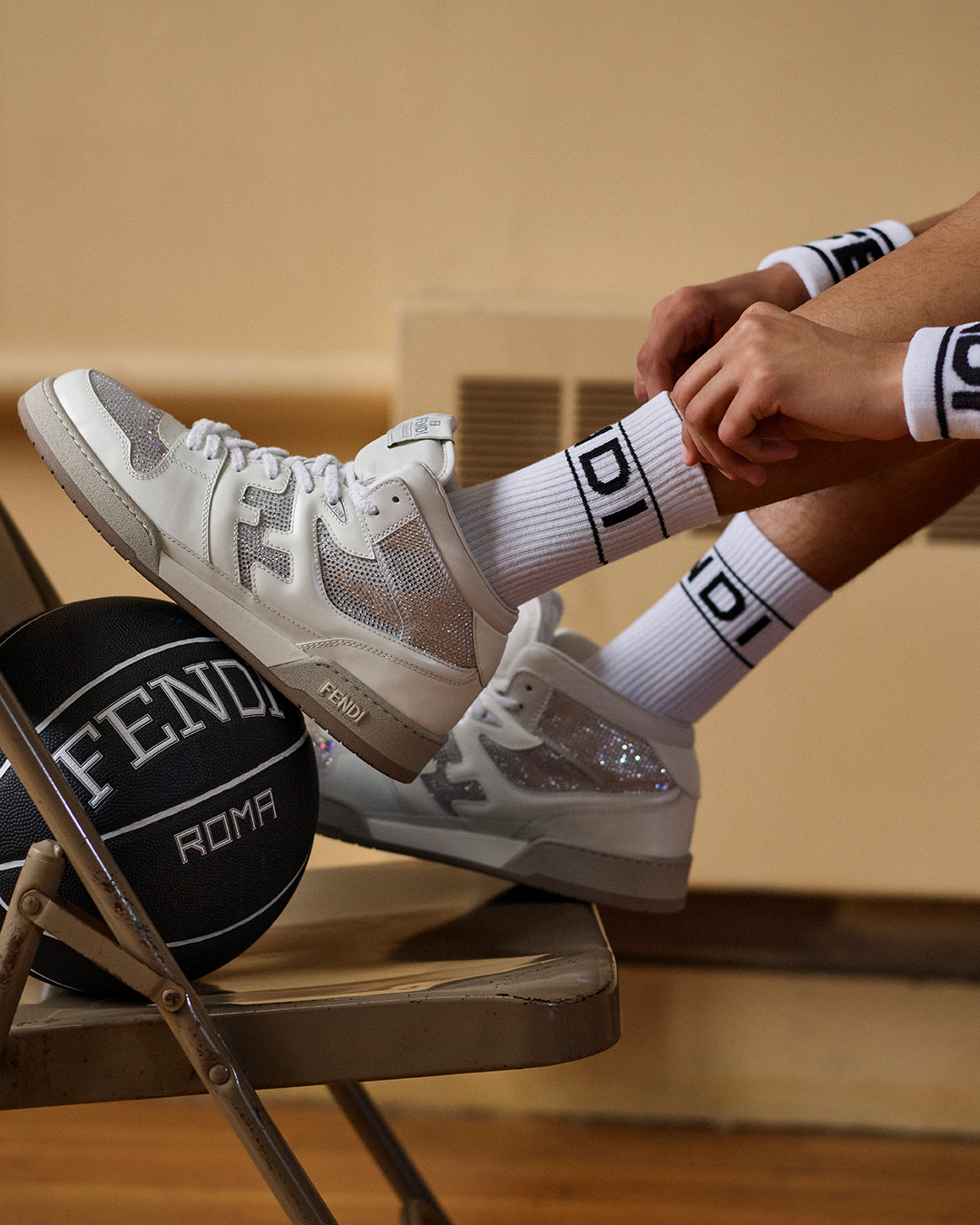 Помимо одежды, Fendi выпустил кроссовки Match (они доступны в двух вариантах — в классическом черно-кремовом цвете и эксклюзивной версии total white, украшенной кристаллами). А также теннисные носки, комплект из напульсников и повязки на голову, брелок в виде черной бейсболки и баскетбольного мини-мяча.