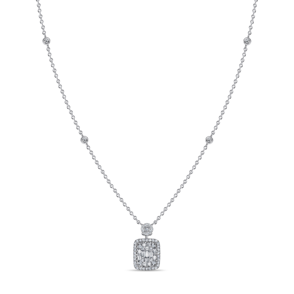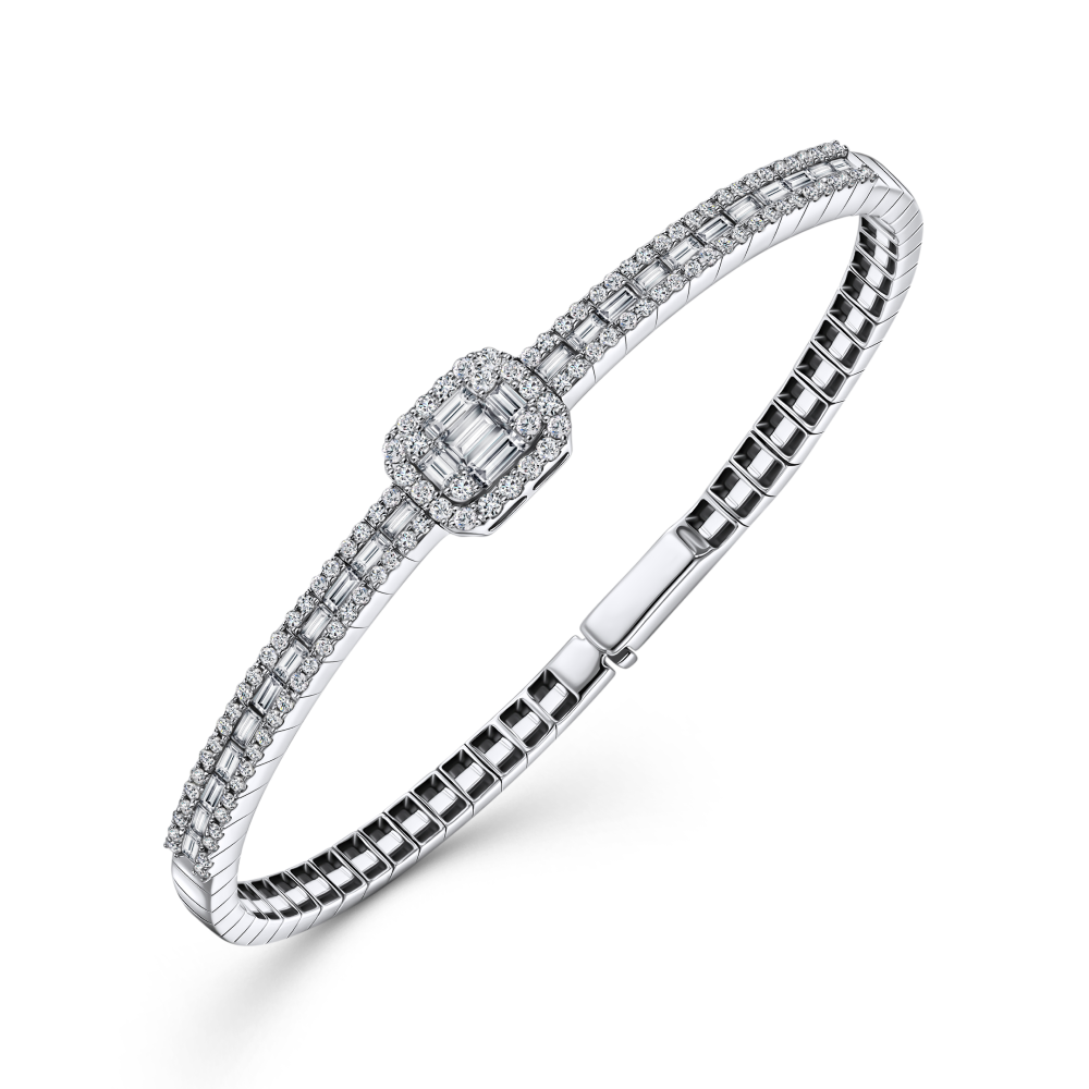 В колье пазл с двух сторон поддерживают цепи якорного плетения, между объемными звеньями которых точечно сияют круглые бриллианты, а камень покрупнее стал блестящим мостиком к бриллиантовому панно. В браслете главного героя удерживает в крепких объятиях твердый обод из белого золота. Он также усыпан бриллиантами, которые отчасти повторяют полюбившуюся нам композицию: камни в огранке «багет» выстроились стройной линией, и на каждый из них приходится четыре круглых камня — по паре с каждой стороны для большего блеска.