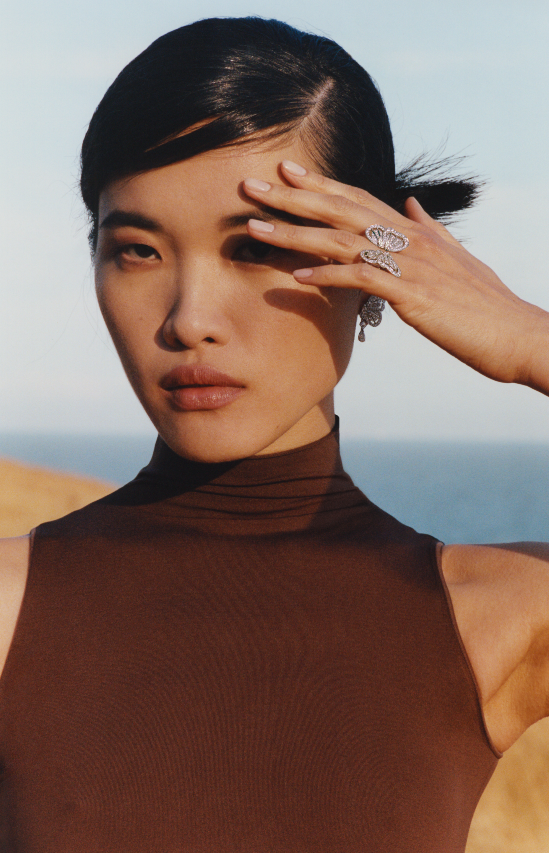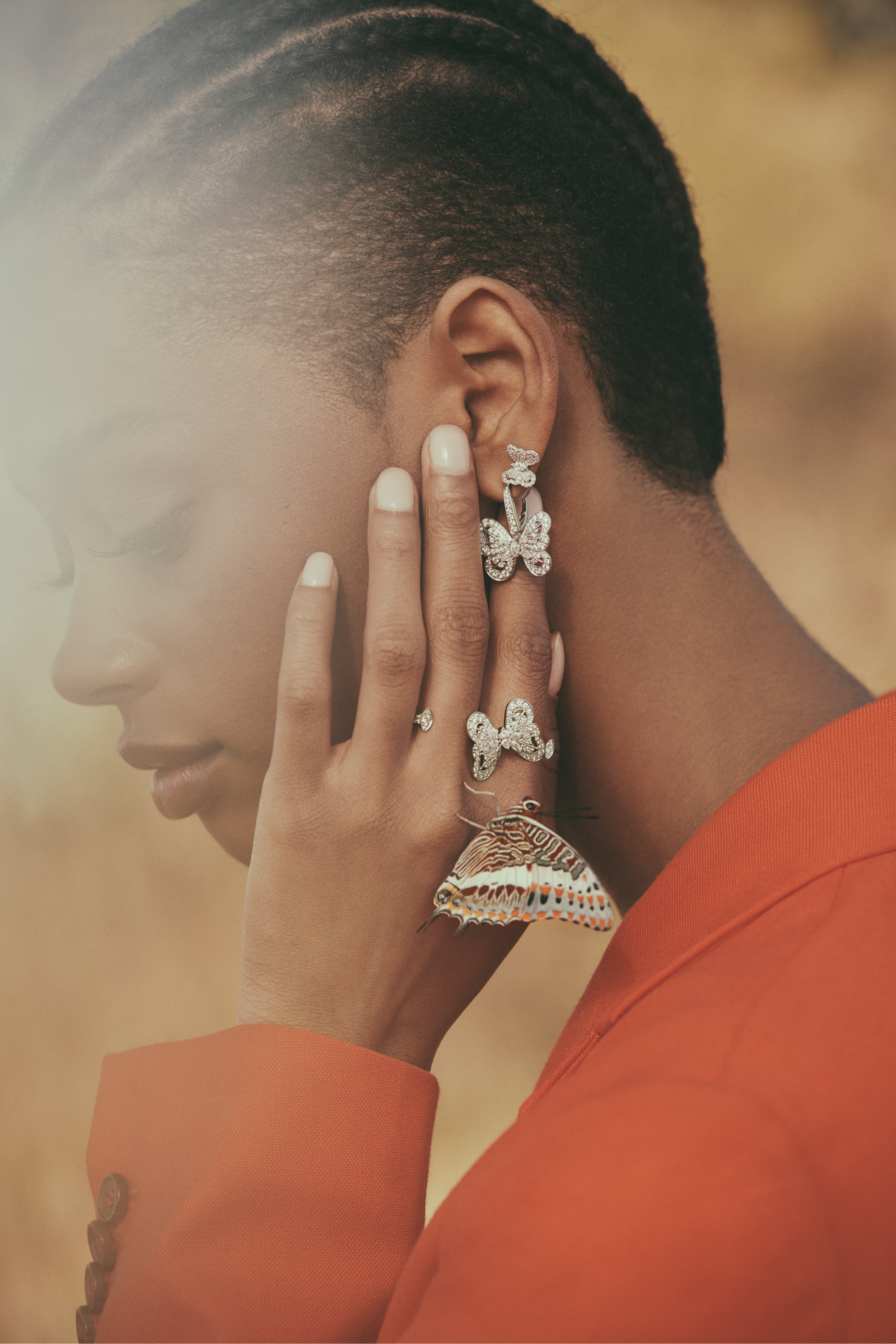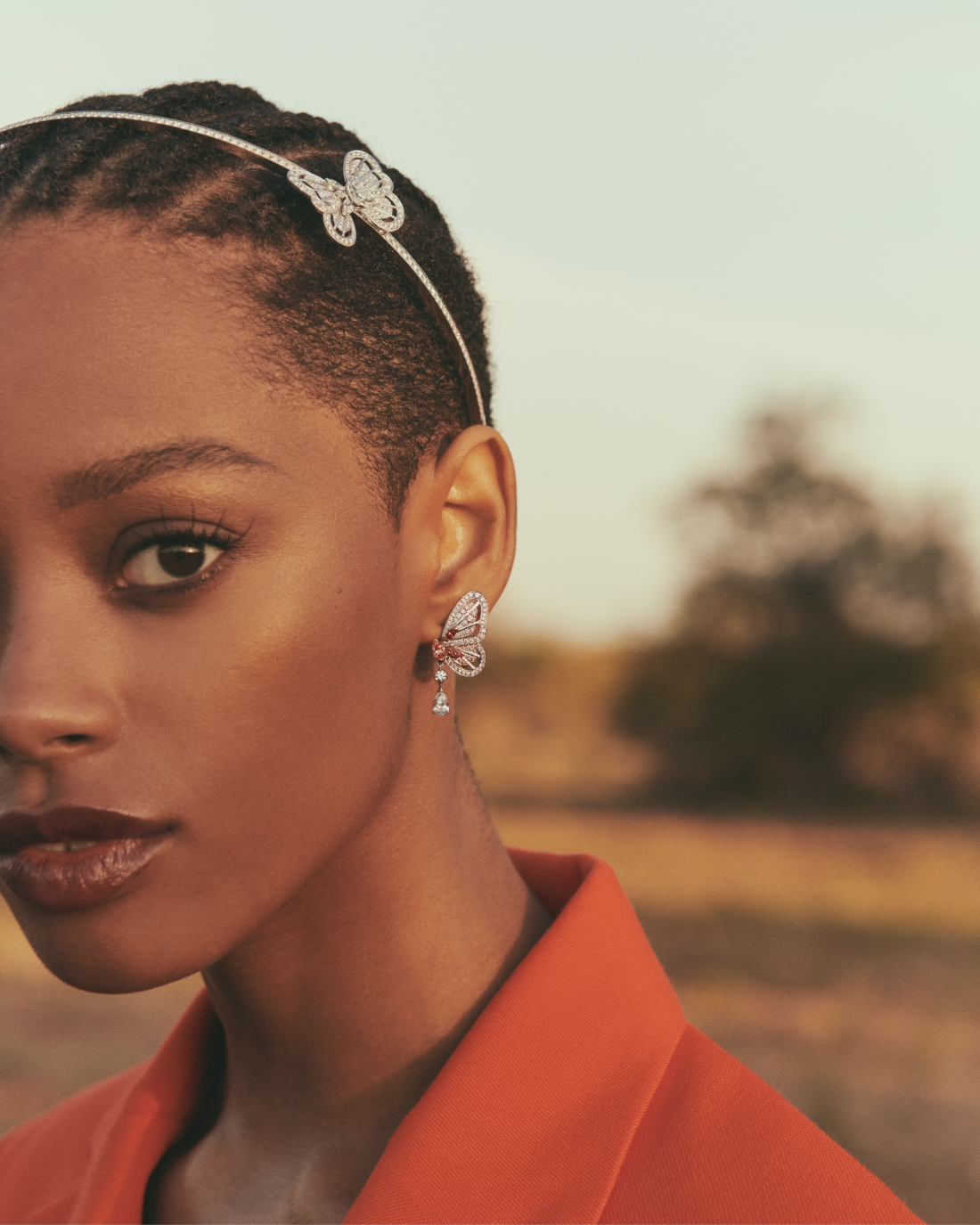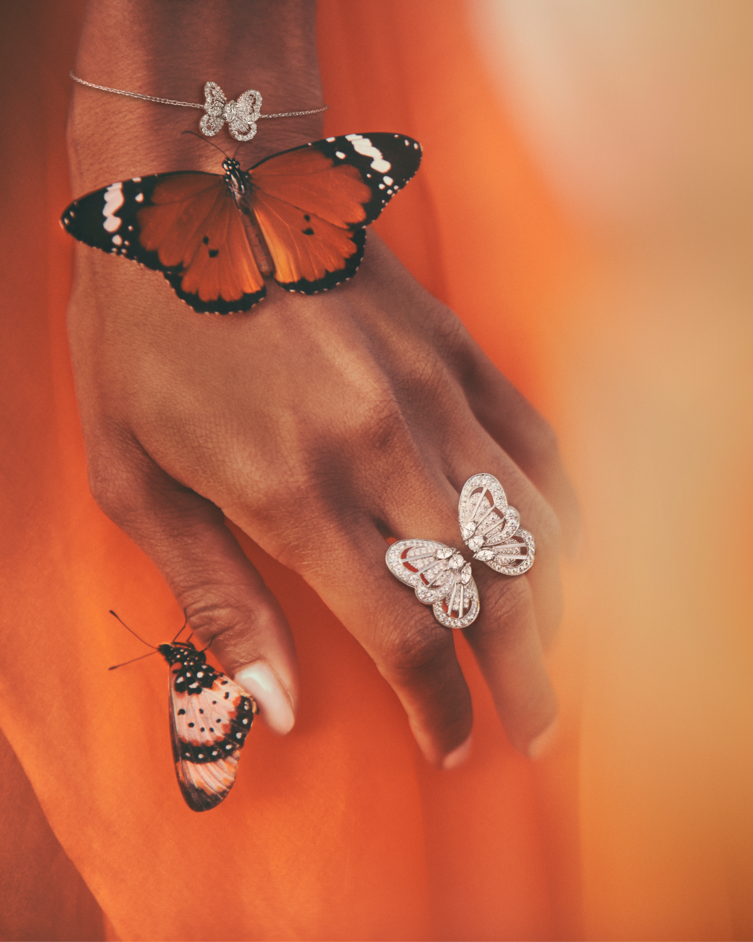 Коллекция Butterflies — это украшения Fine Jewelry и High Jewelry. В линейке первой представлены изделия из белого и розового золота с белыми бриллиантами. Линейка High Jewelry — это украшения еще и с яркими камнями, которые повторяют природный окрас того самого африканского монарха.