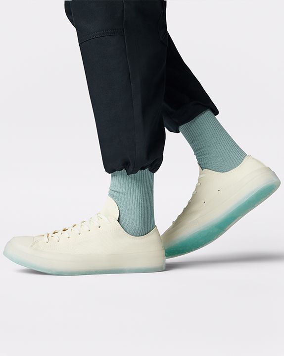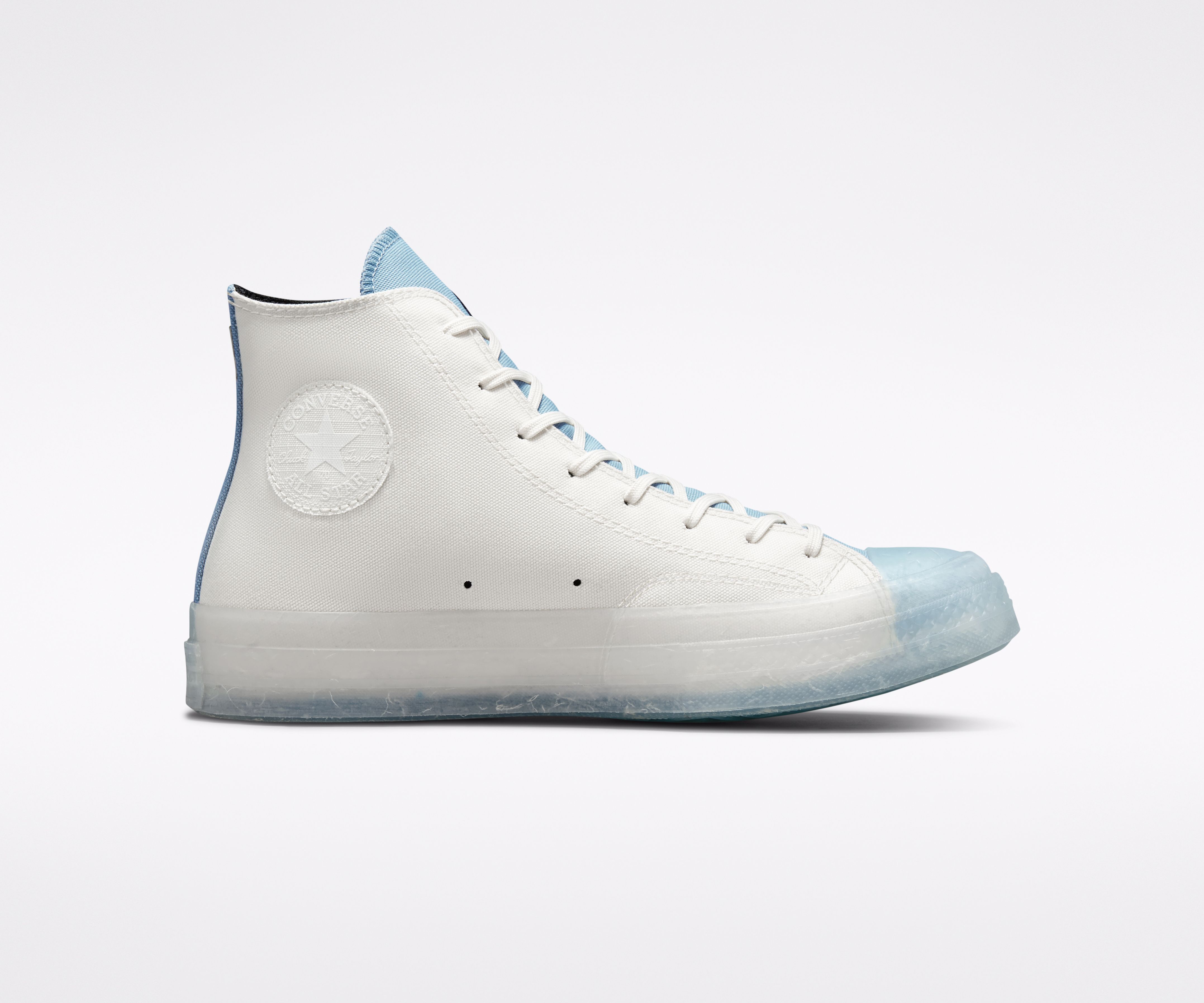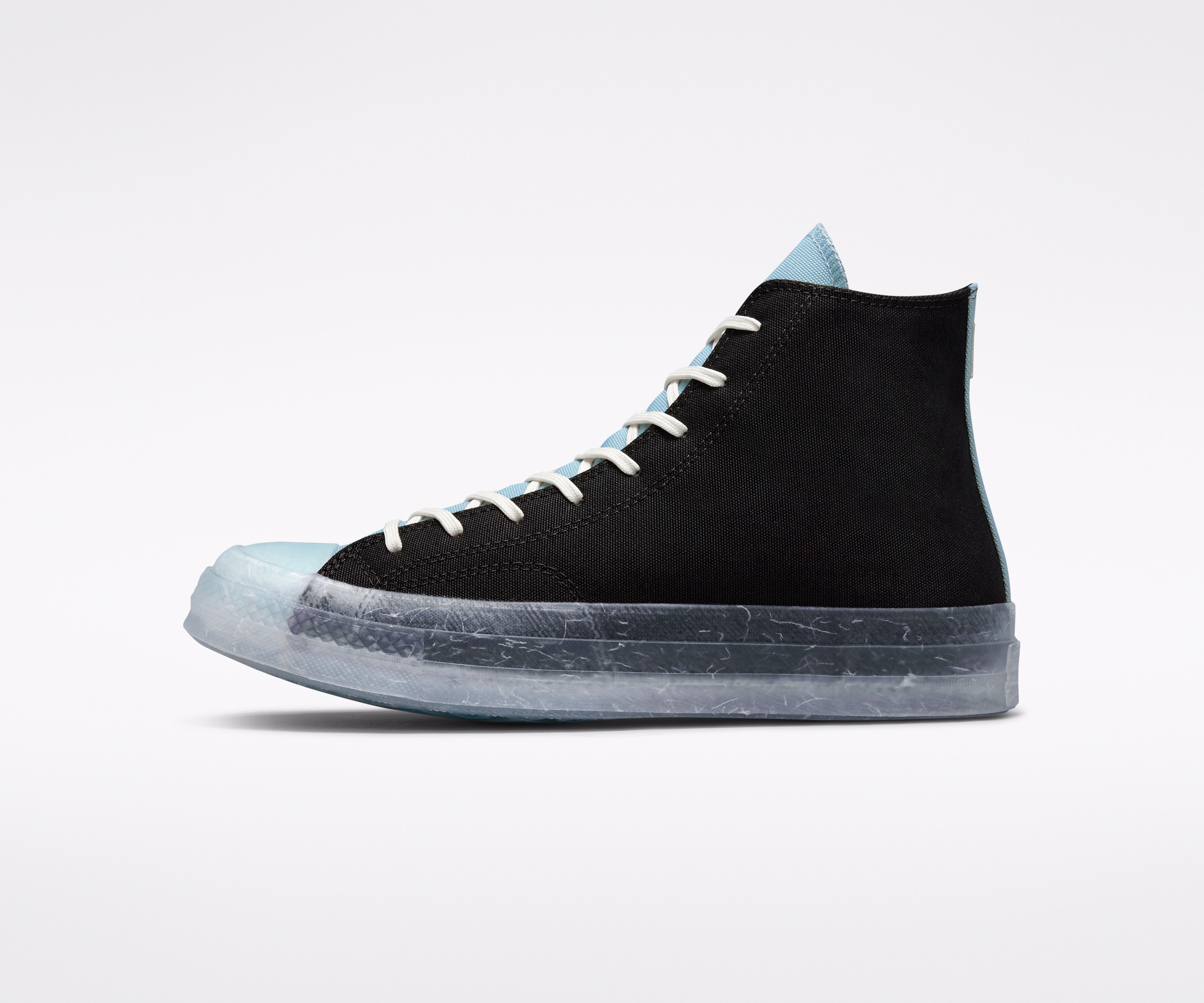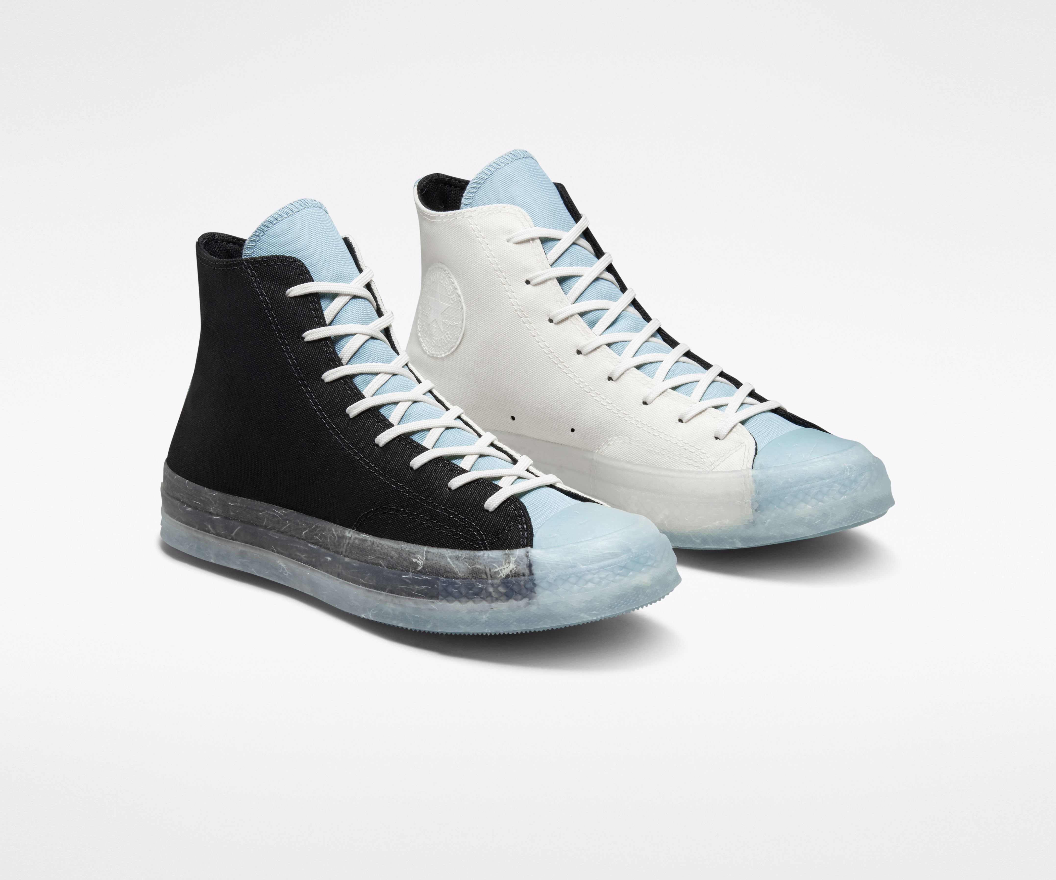 В новую коллекцию вошли два классических силуэта — Chuck 70 Hi и Chuck Taylor All Star. Верх обеих моделей разработан из 100%-ных переработанных тканей, пятка из 50%-ного переработанного TPU и даже стелька OrthoLite — из 20%-ного переработанных материалов. Высокие Chuck 70 Hi выполнены в черно-белом цвете с голубой вставкой, а низкие Chuck Taylor All Star в молочном оттенке с мятной подошвой.