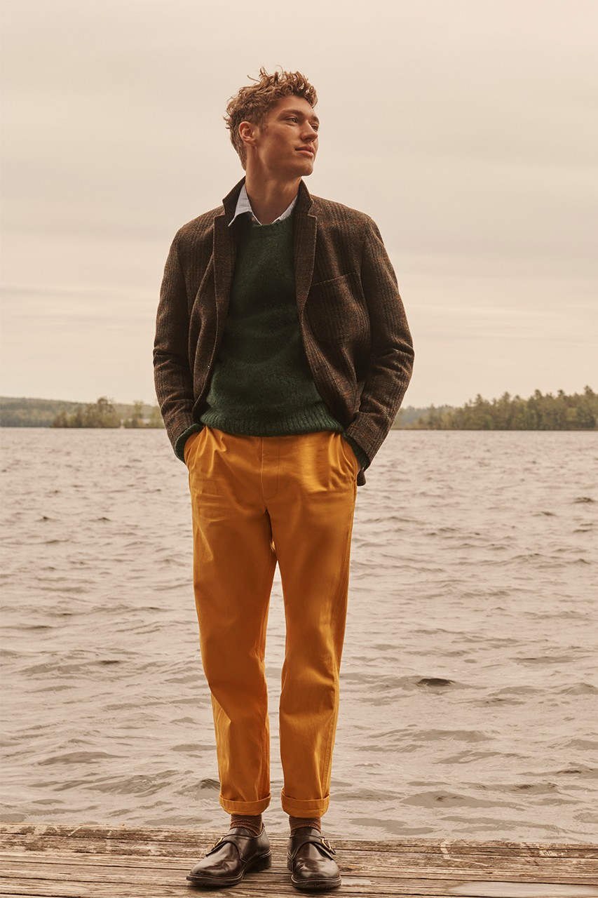 В нее вошли кашемировые свитеры, блейзеры из шотландской шерсти, оксфордские рубашки, брюки-чиносы и жакеты. Одежду дополняют галстуки, панамы и кепки. В цветовой палитре преобладают приглушенные тона — темно-зеленый, коричневый, горчичный, бардовый и синий.
