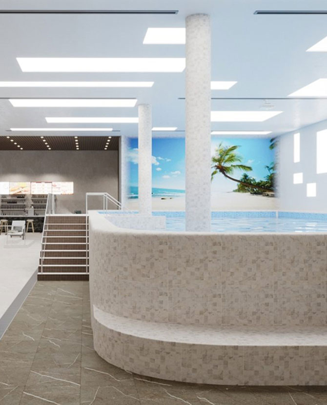 На его территории будут три зоны: термозона с русскими парными, нефритовой, гималайской и травяной саунами, марокканским хаммамом и кабинетами, аквазона с развлекательным и детским бассейнами, душем впечатлений (с подсветкой и подзвучкой), а также спа-зона. Кроме того, тут откроют ЗОЖ-кафе, помещения для медитации, занятий термальной йогой и водной гимнастикой, а на улице появится всесезонный термальный бассейн.