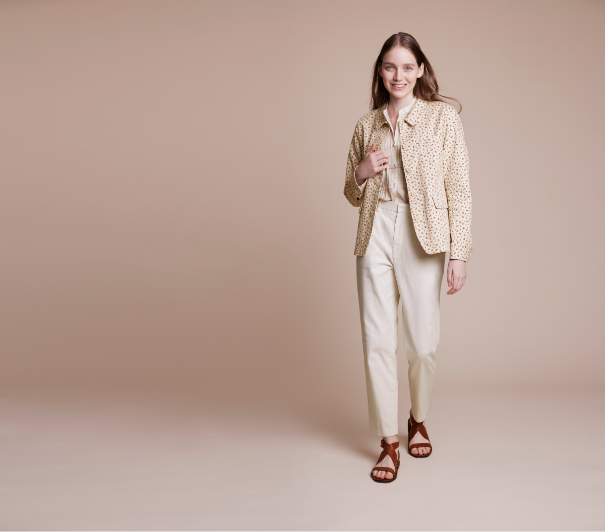 В коллекции есть спортивные костюмы, рубашки и жакеты из выстиранного хлопка и льна, платья с цветочными принтами, брюки, пиджаки, юбки и свитера. Палитра — цвета французского флага: синий, белый и красный.