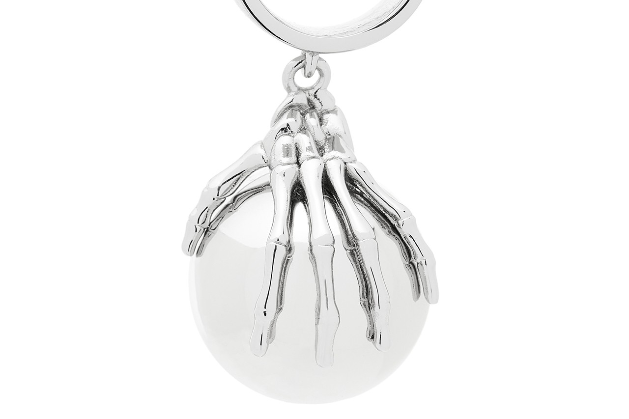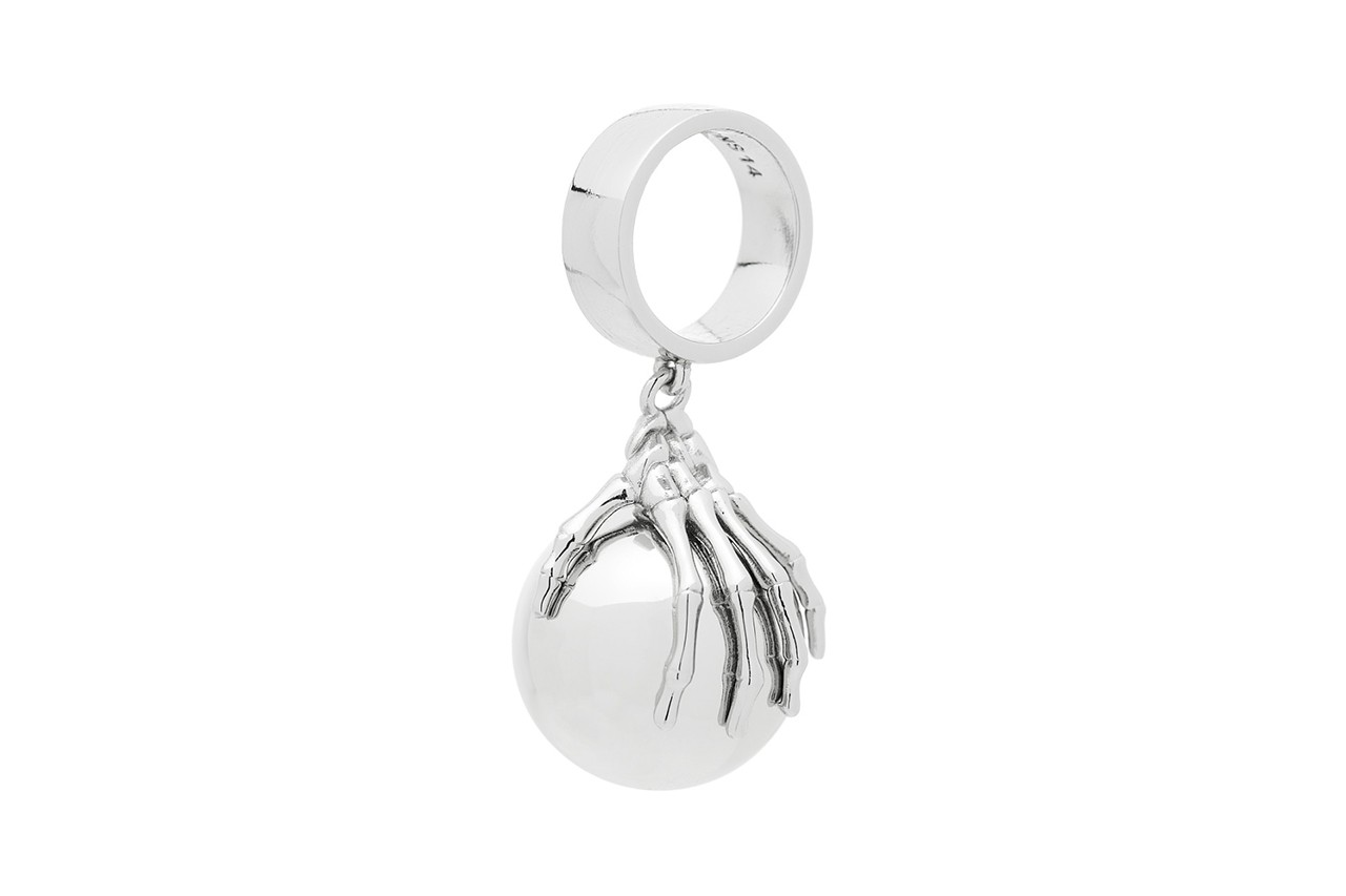 Кольцо выполнено из серебристой латуни в форме руки скелета, которая держит сферу. Поверхность украшения отполирована до блеска, внутри расположен логотип Raf Simons.