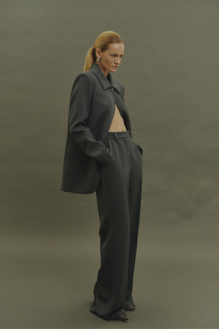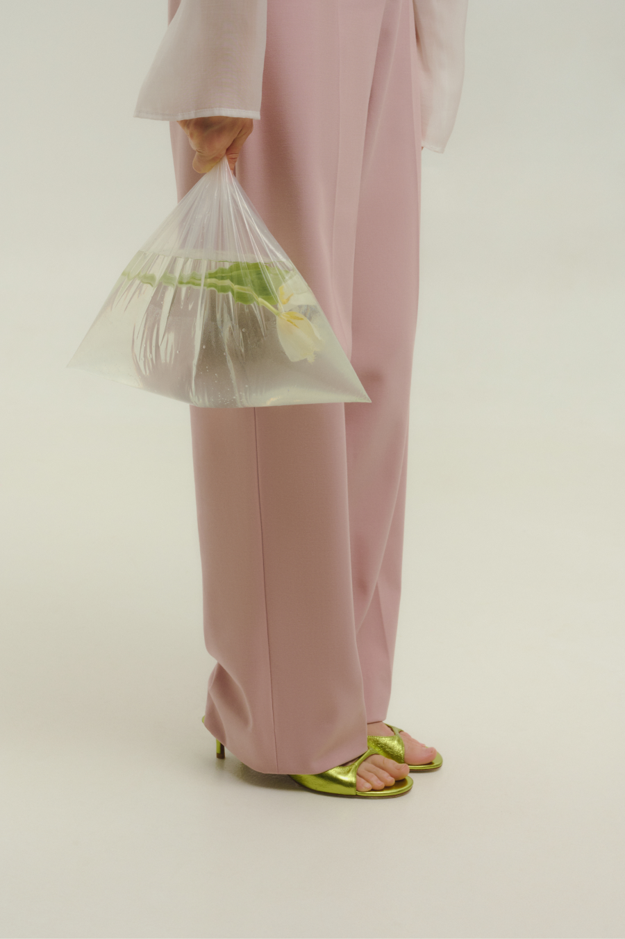 В коллекции широко использованы разнообразные фактуры: объемные, жатые, атласные, прозрачные, деним и вязаный трикотаж. Костюмная группа представлена жакетами в пастельных оттенках, которые выполнены из принтованного итальянского трикотажа. В качестве акцентов можно выделить жакет-пальто, расклешенную юбку из костюмной ткани и блузу с воланами.