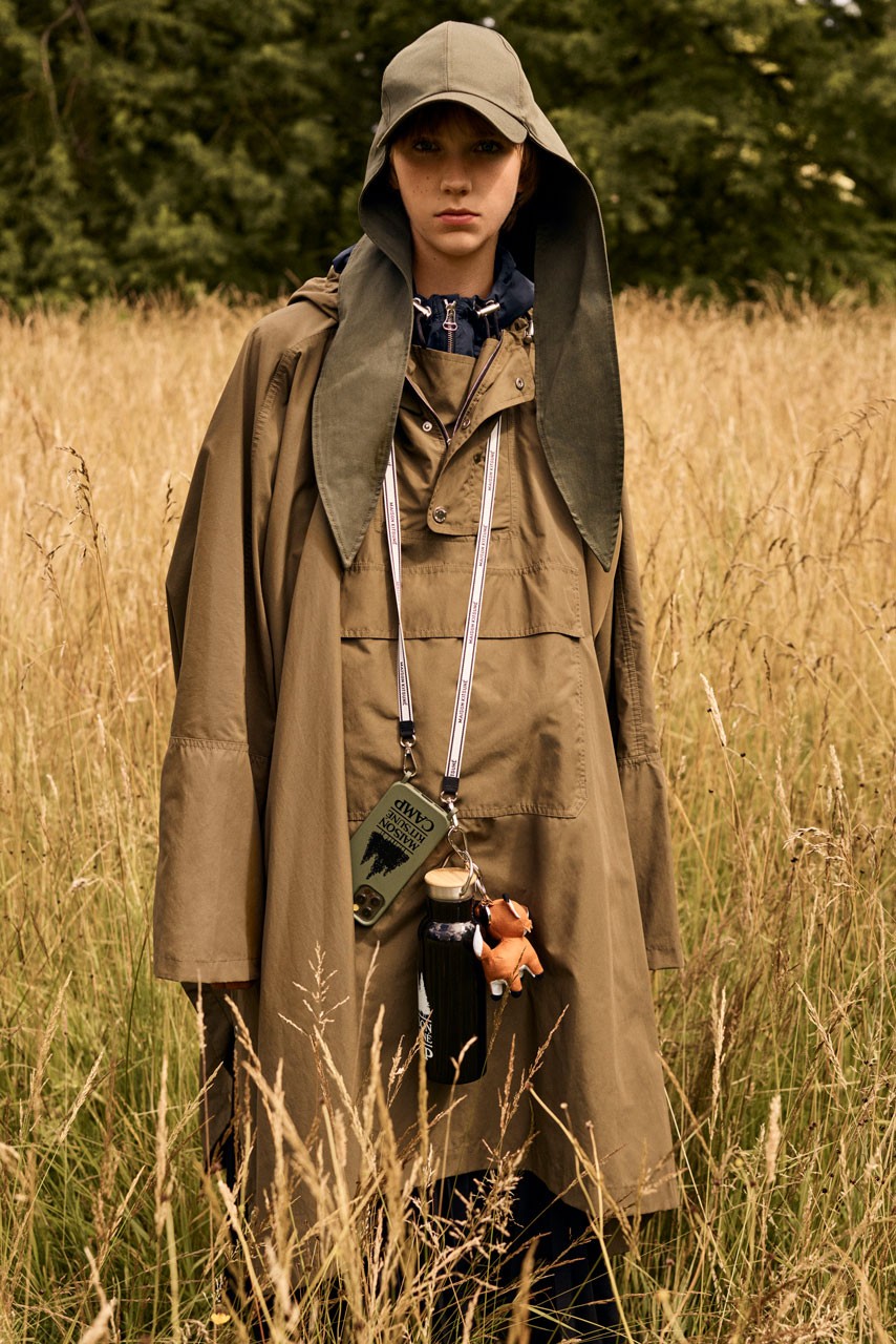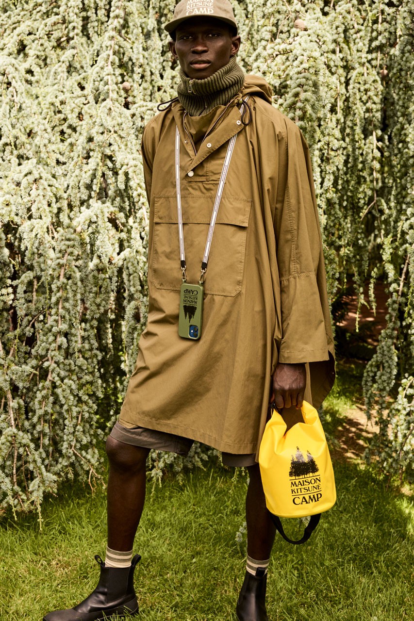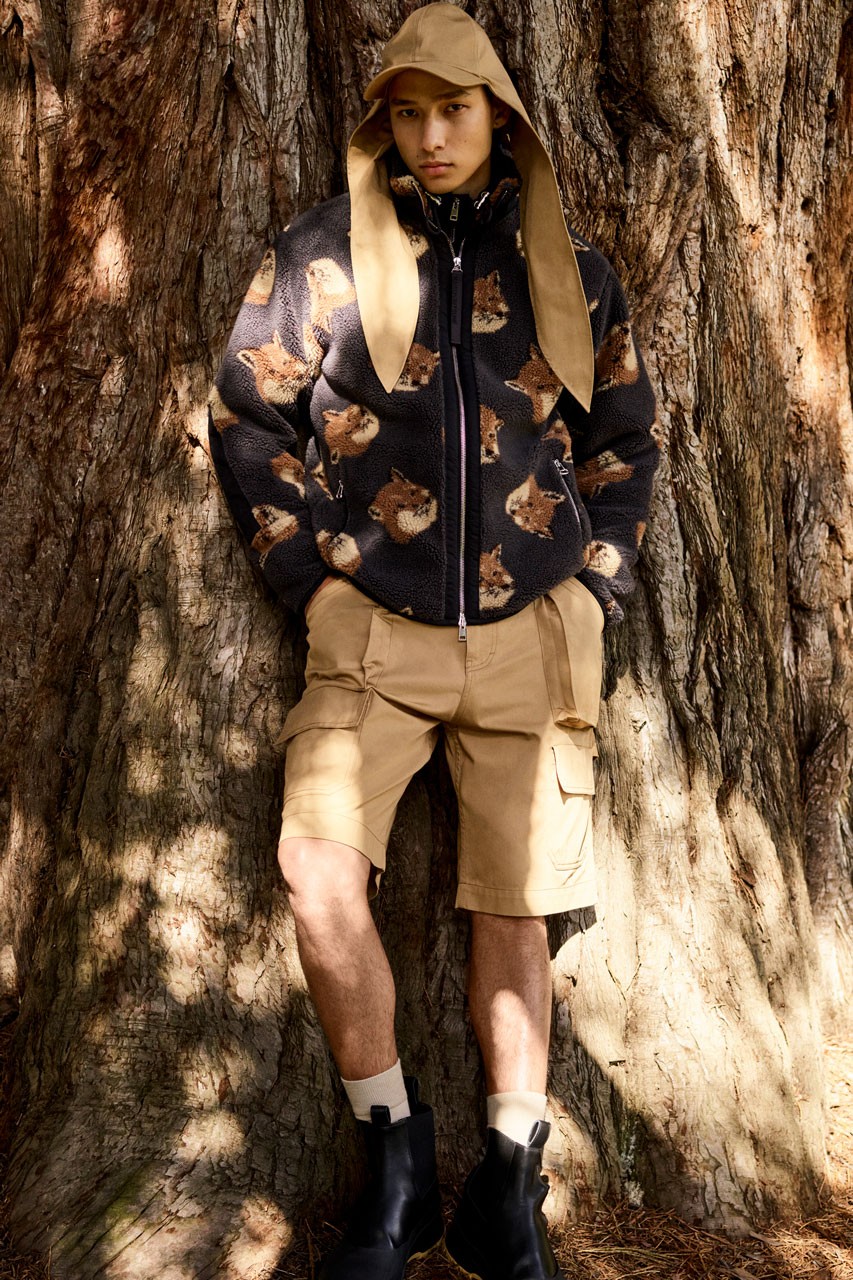 В коллекцию вошли рубашки с карманами на груди, свитшоты с принтами, свитеры с воротником на молнии, шорты карго, свободные брюки, однобортные пиджаки, анораки, тренчи, парки, вместительные сумки и ботинки челси на фактурной подошве. Палитра варьируется от песочного, голубого и белого до коричневого, темно-синего и полотно-зеленого цветов. В соответствии с тематикой был использован камуфляжный рисунок, составленный из силуэтов лис — символа Maison Kitsuné.
