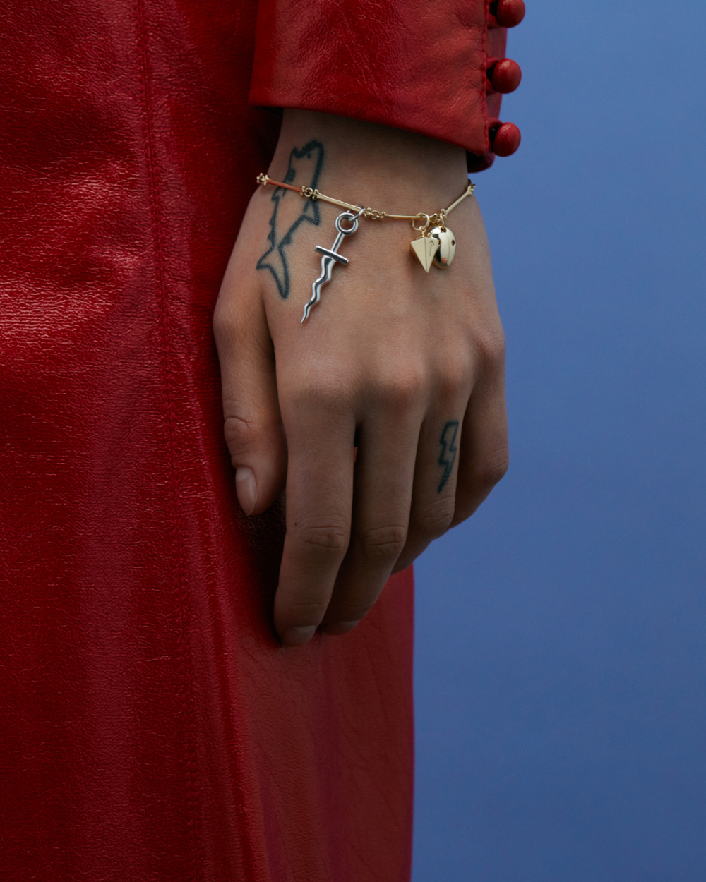 Такие украшения в Avgvst называют «тринкеты» (от английского trinket — «безделушки»). Носить их можно в разных сочетаниях, например надеть не только на цепочку или серьгу-хуп, но и на колье и браслет из золотых косточек.