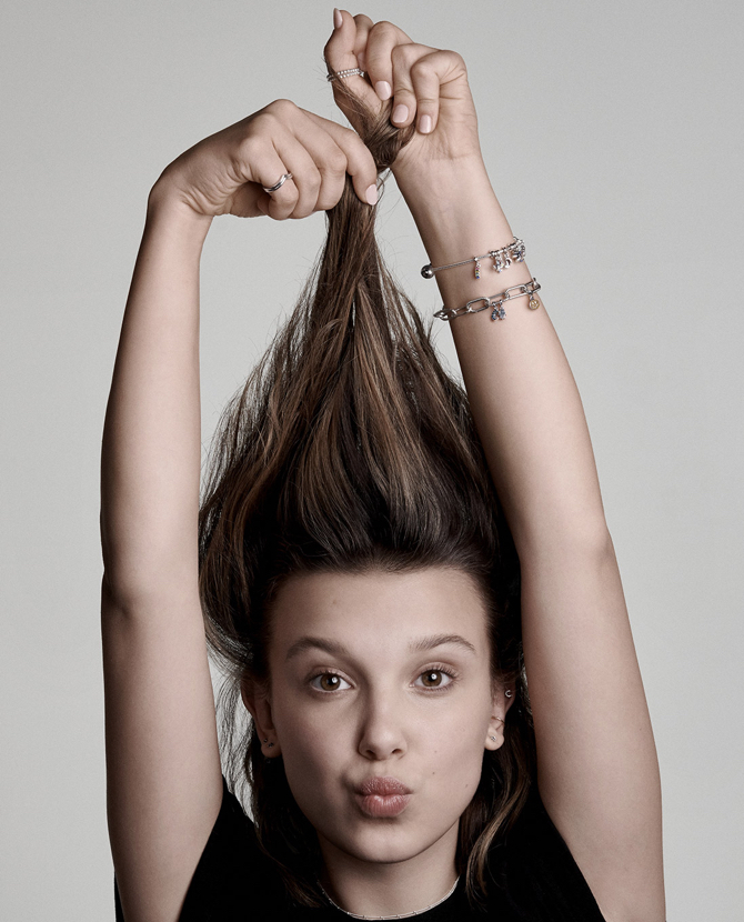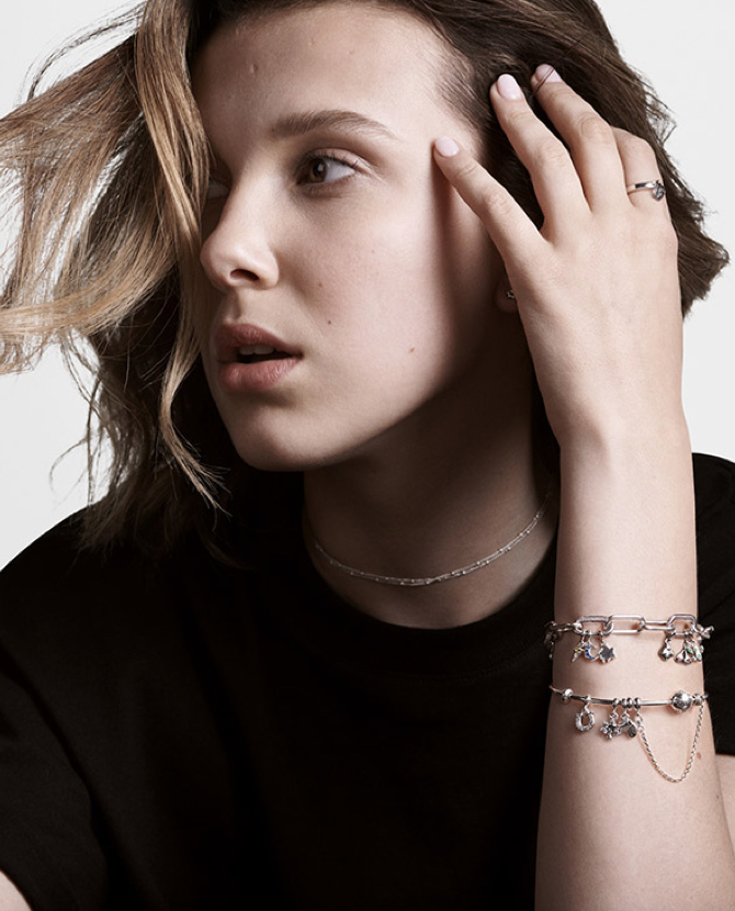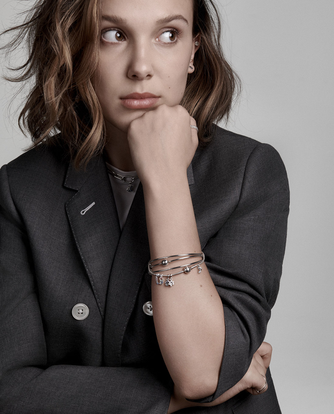 Милли Бобби Браун, известная по роли Одиннадцать в сериале Netflix «Очень странные дела», стала новым амбассадором Pandora. Ювелирный бренд подписал двухлетний контракт с 15-летней актрисой. Полностью первая рекламная кампания с участием Милли Бобби Браун появится в октябре и станет важным элементом глобального перезапуска марки, а пока в Сети появилось несколько снимков, на которых она позирует в браслетах с шармами, подвесках и серьгах Pandora.