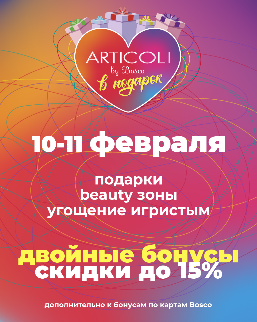 В честь этого события Articoli дарит подарки всем посетителям. Совершайте покупки с двойными бонусами по системе привилегий Bosco и скидкой до -15% на любимые бренды косметики и парфюмерии, угощайтесь игристым и не забудьте свои подарки.