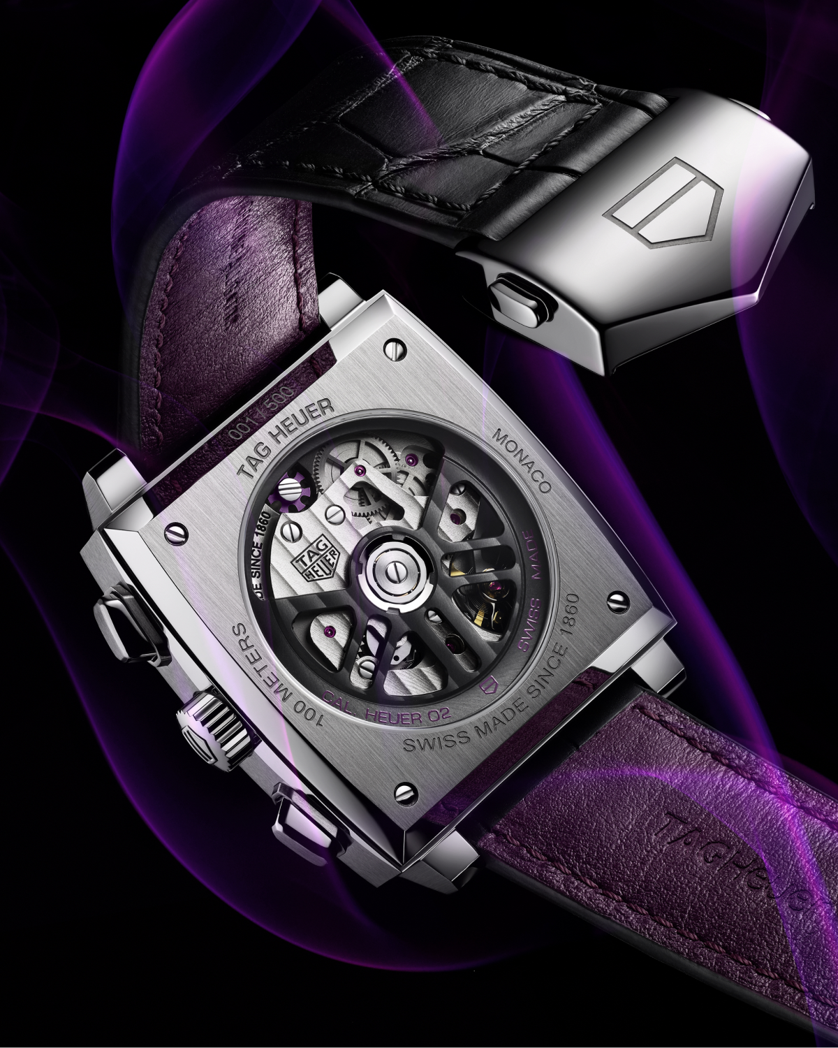 Другая отличительная деталь модели — механизм хронографа Calibre Heuer 02. Наблюдать за его работой можно через заднюю крышку из сапфирового стекла. Дополняет часы черный ремешок из кожи аллигатора — фиолетовый с внутренней стороны.