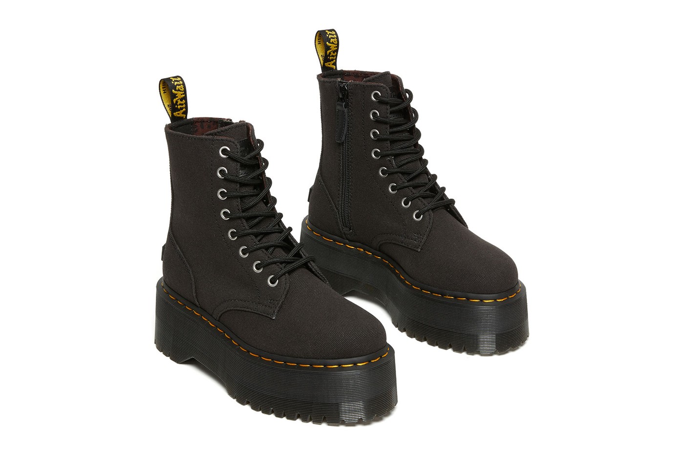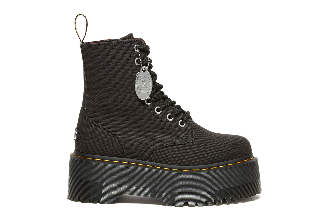 В новой модели сохраняется оригинальный силуэт ботинок, они выполнены из черной холщовой ткани, подчеркнутой фирменной желтой строчкой Dr. Martens. Завершает дизайн модели серебряная бирка, свисающая со шнурков.