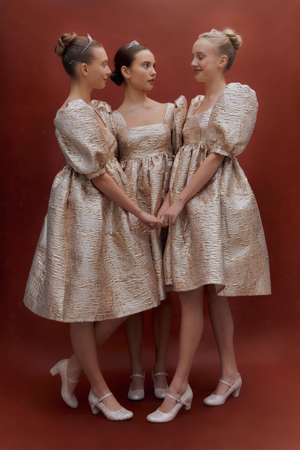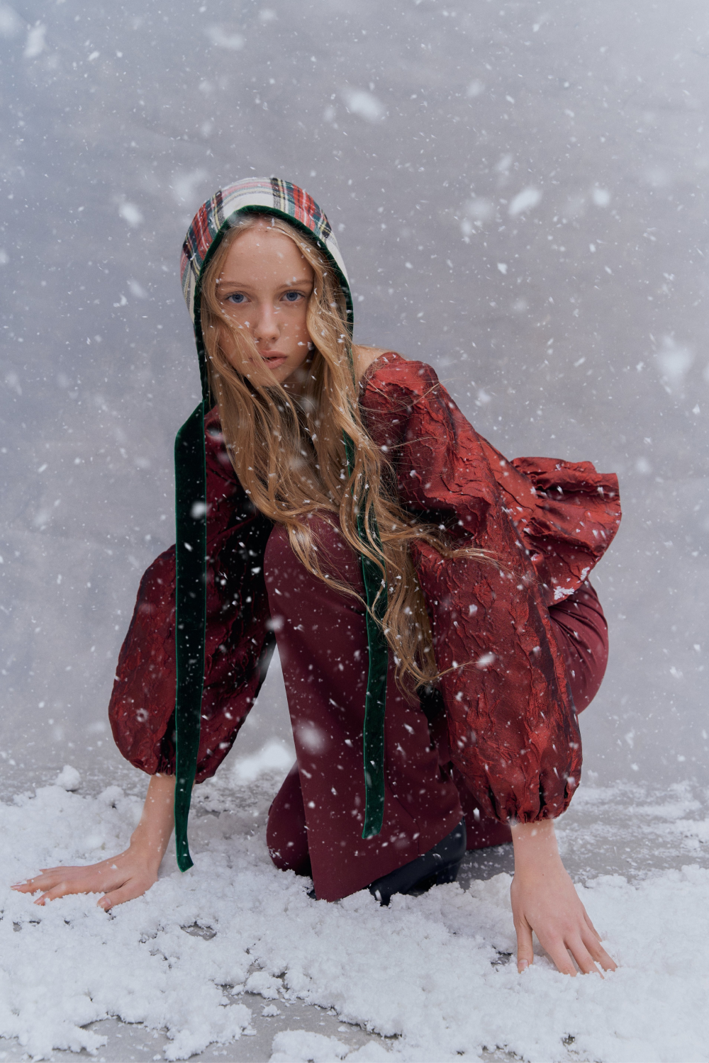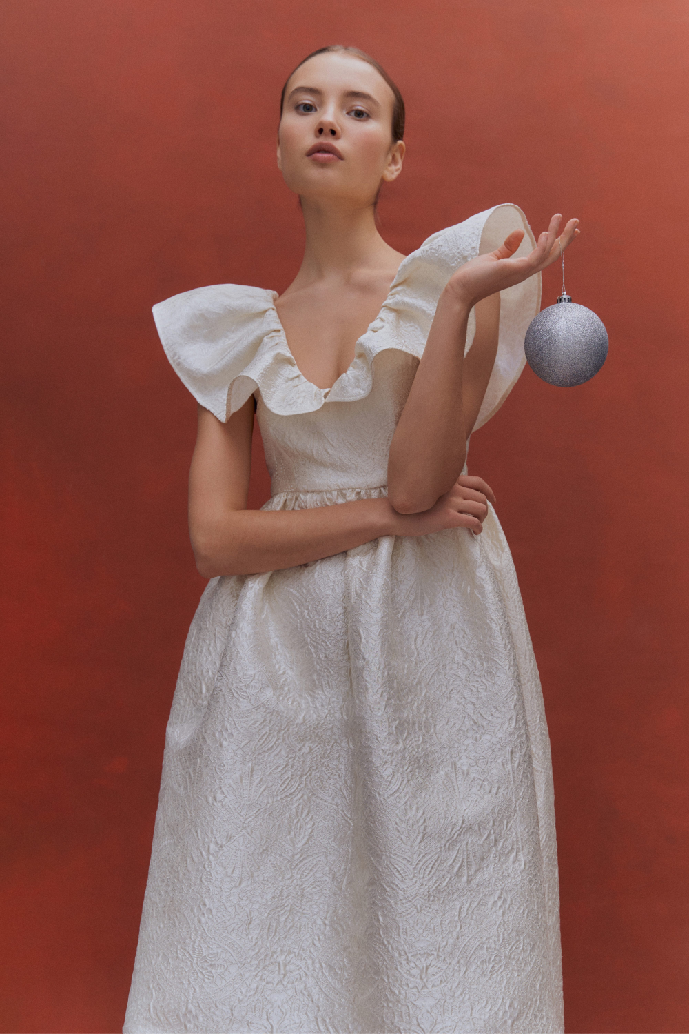 Серый топ из тафты Stormy Grey напоминает о морской буре и силе волн. А Royal Gold повторяет форму кукольного платья с пышной юбкой. Жемчужное платье миди с большим декоративным воротником Tsarina — новая форма для Abitu. В образах есть многое из мира танца — юбки-пачки, бальные туфли и гладкие прически, а также сказочные мотивы: современные Герда и Шахерезада, фея Драже и Снегурочка.