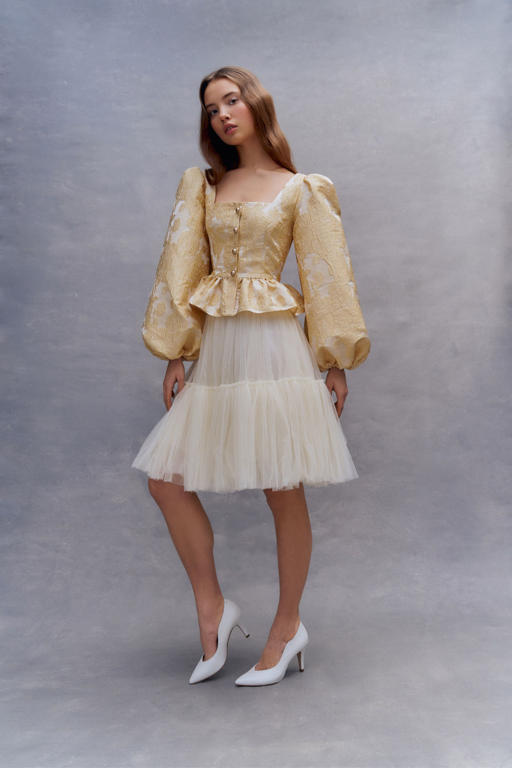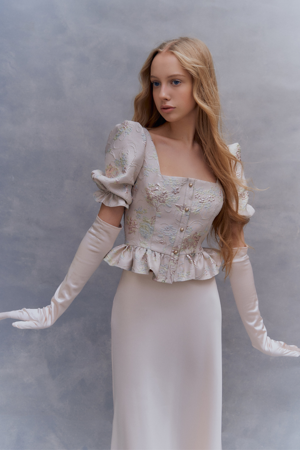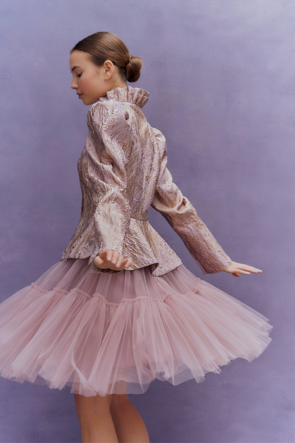 Серый топ из тафты Stormy Grey напоминает о морской буре и силе волн. А Royal Gold повторяет форму кукольного платья с пышной юбкой. Жемчужное платье миди с большим декоративным воротником Tsarina — новая форма для Abitu. В образах есть многое из мира танца — юбки-пачки, бальные туфли и гладкие прически, а также сказочные мотивы: современные Герда и Шахерезада, фея Драже и Снегурочка.