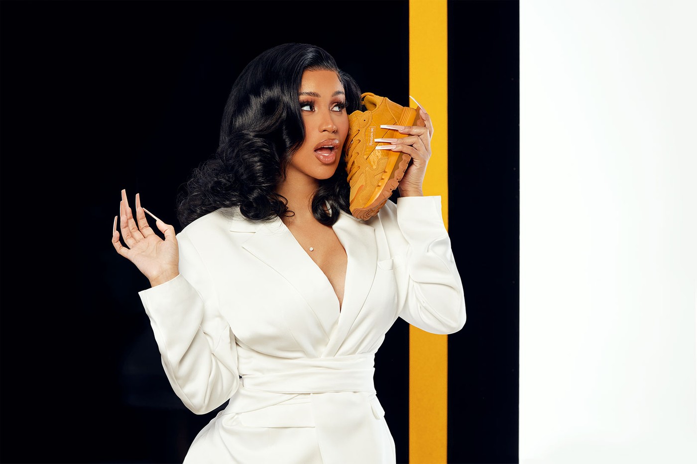 Работая вместе с дизайнерами Reebok, Cardi B дополнила классический силуэт Classic Leather вставками из замшевого и атласного материала и массивной подошвой, взятой из модели Legacy 83.