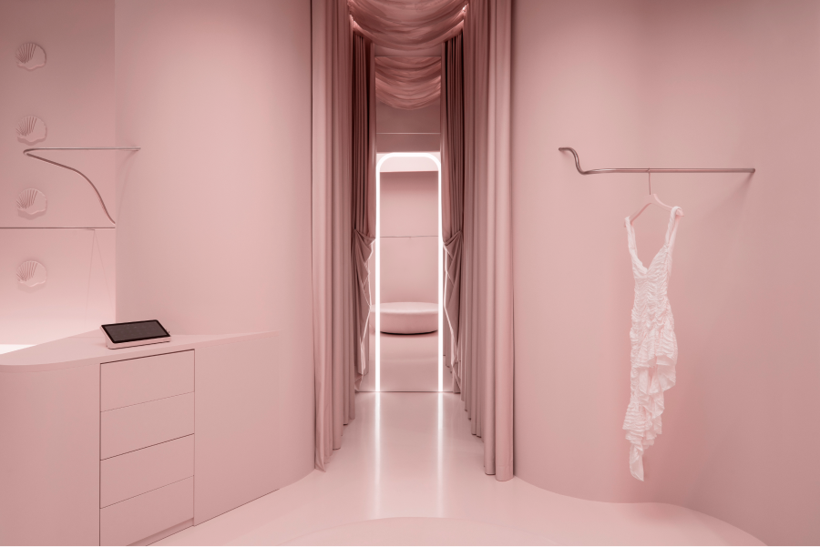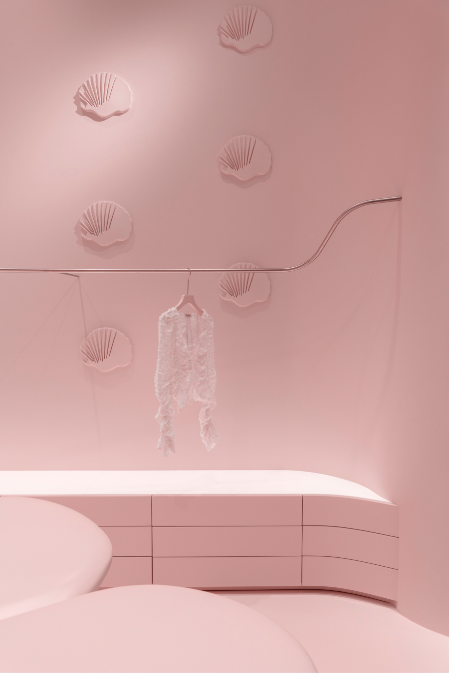 Плавные изгибы стен отсылают к теме женственности, которая является основной для бренда. Здесь учтены все детали для идеального шопинга и, конечно, контента: четко выверенный оттенок и направление света в примерочных, идеальные выбеленные зеркала и мягкие ковры-ракушки, барельефы на стенах и красота фактуры всех элементов магазина. Дизайн пространства разработан архитектурным бюро Muno Design.