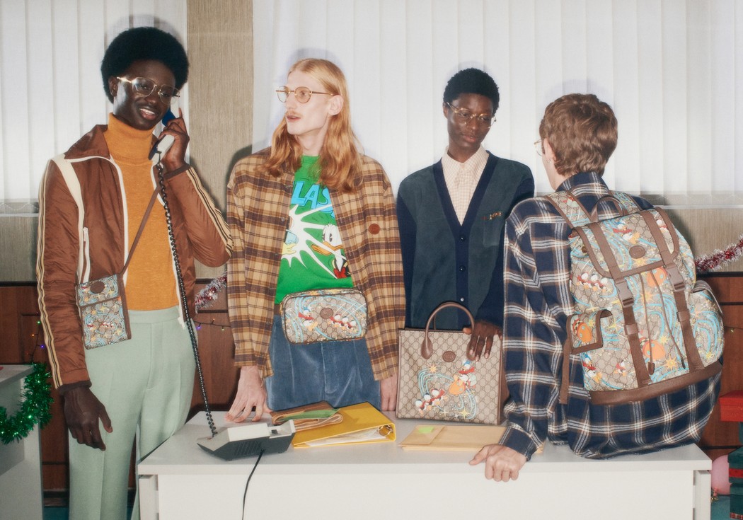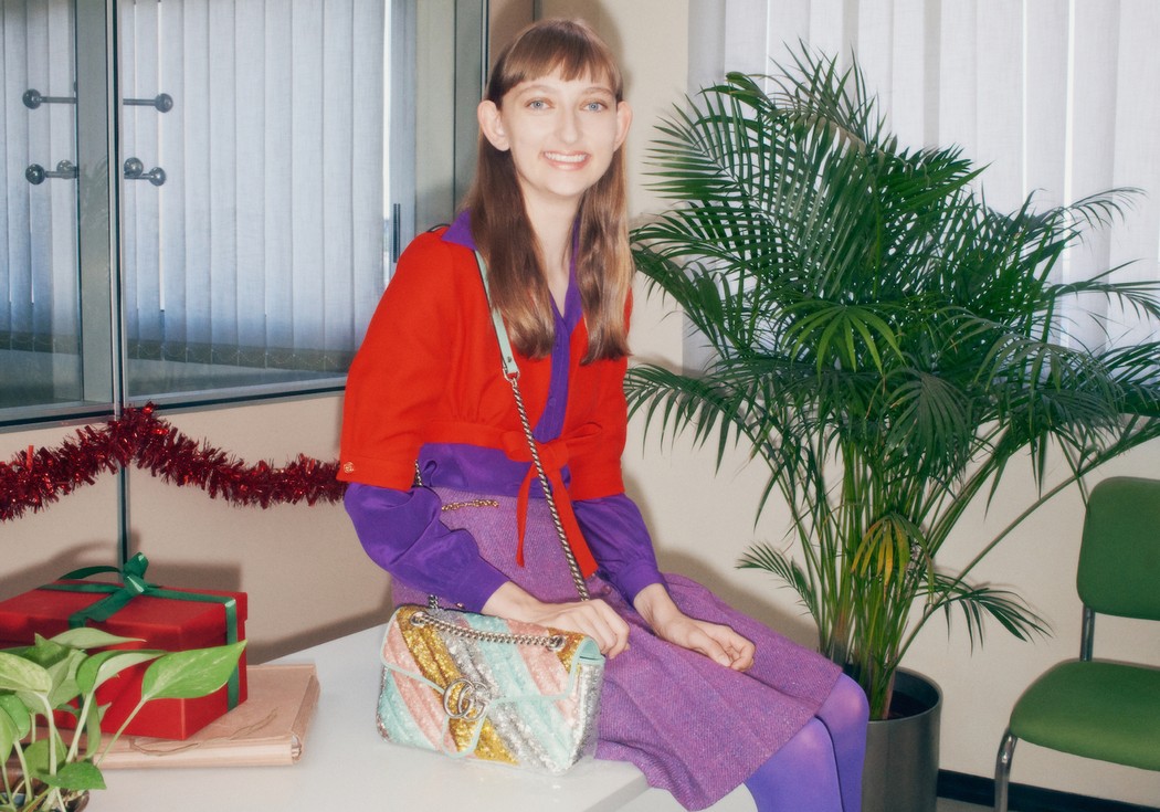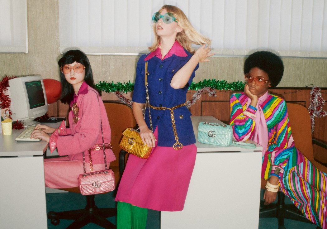 Gucci показал фотографии и видео из праздничной рекламной кампании, которая была стилизована под офисную новогоднюю вечеринку 1980–1990-х годов. Атмосферу передали при помощи интерьеров с винтажной оргтехникой и ретро-образов моделей.