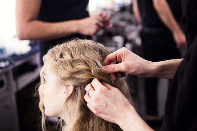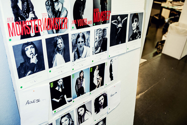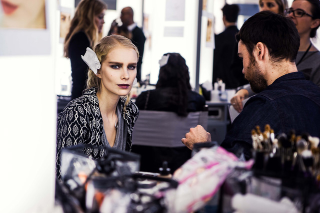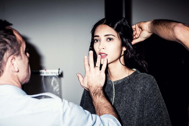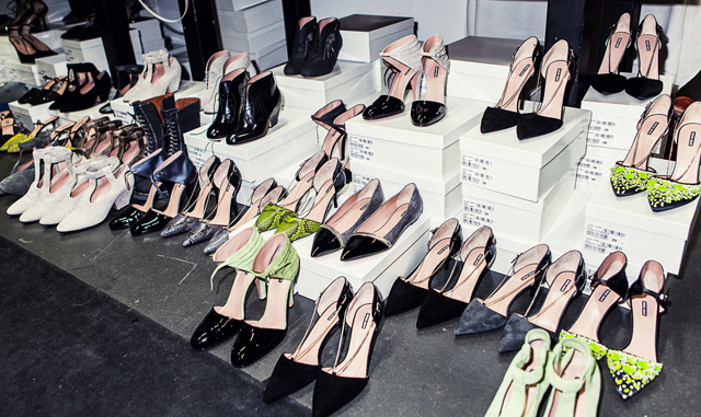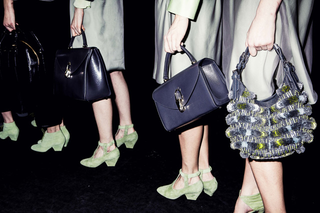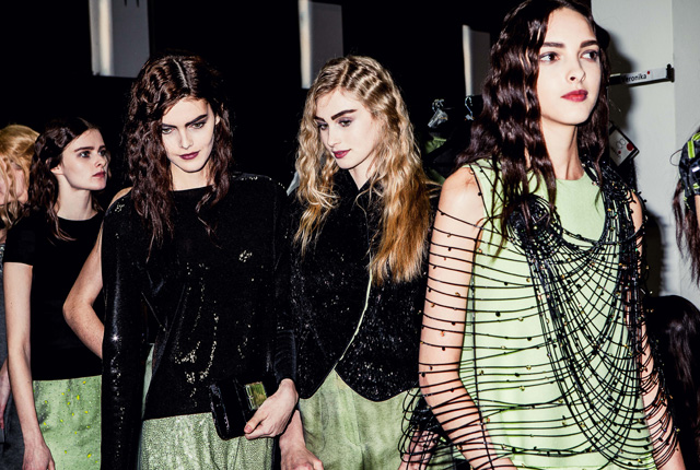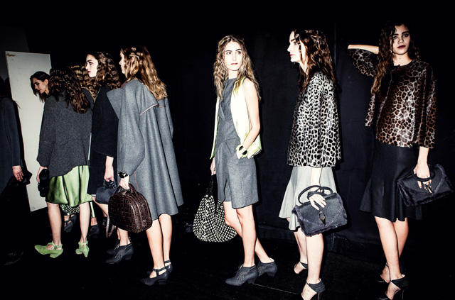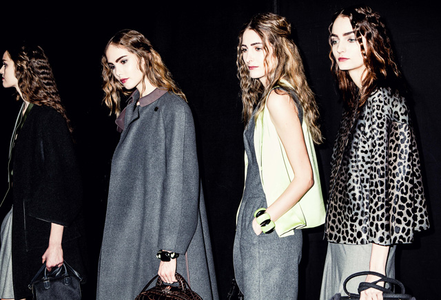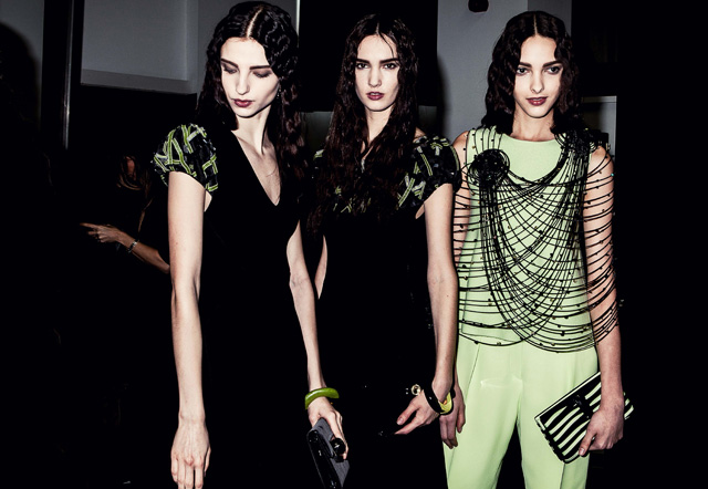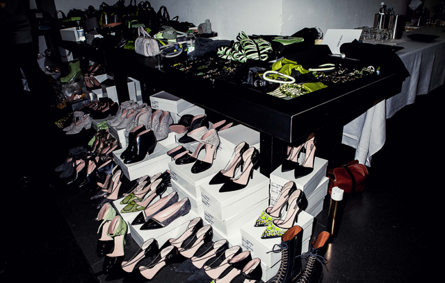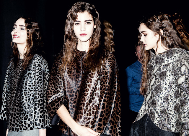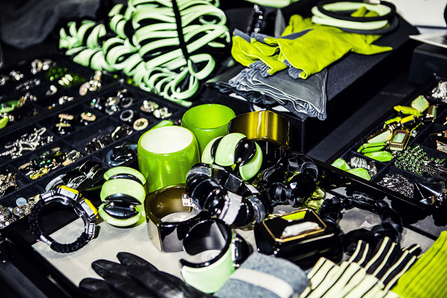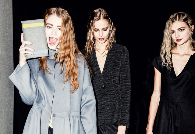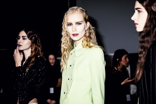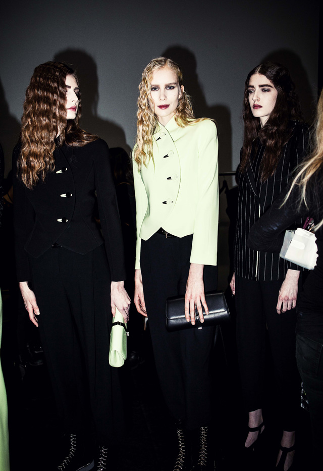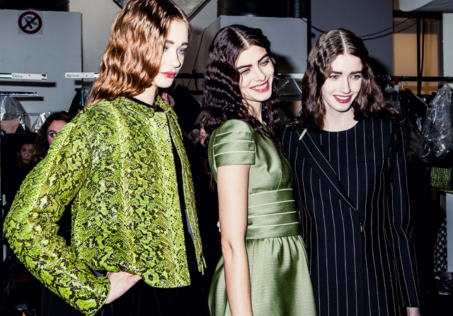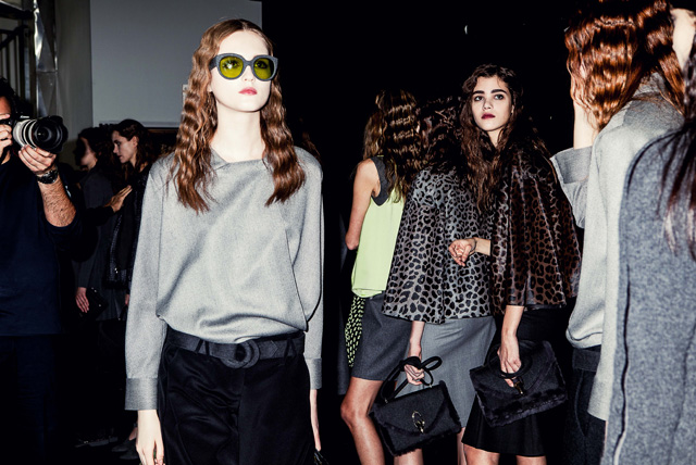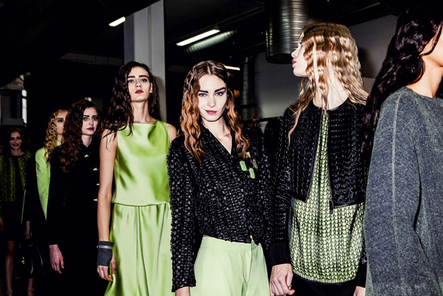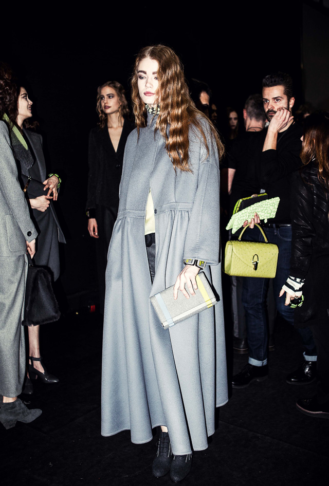 Главным цветом коллекции стал приглушенный лаймово-зеленый — всплески нежного неона разбивали общую серую гамму коллекцию. Мы хорошо рассмотрели одежду, но не смогли в деталях разглядеть аксессуары, замечательные сумки и обувь, поэтому сейчас с вожделение смотрим на выставленные в ряд блестящие туфельки и раскинувшиеся на столах россыпи сережек, колец и браслетов. Визажисты и стилисты красят моделей к показу, а модели улыбаются в камеру и готовятся через считанные минуты шагнуть на подиум.