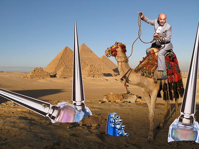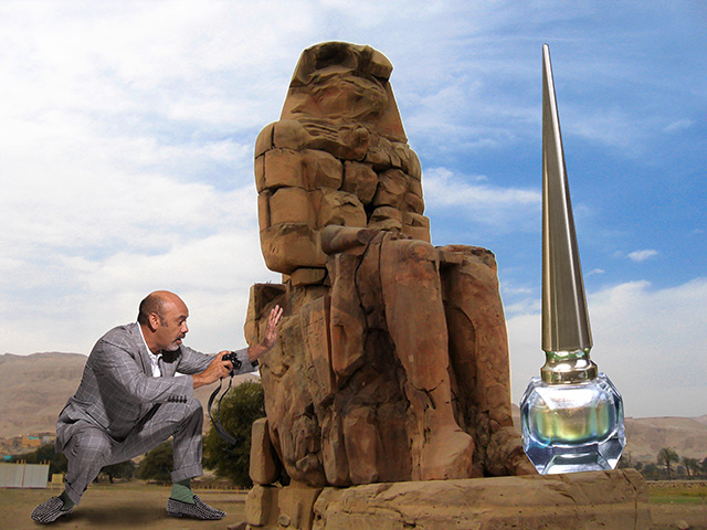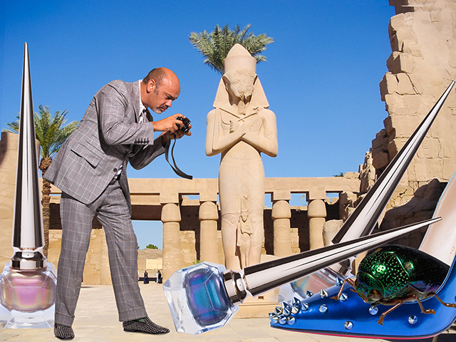 К выходу Scarabée Лубутен представил ироничный лукбук, в котором сам и снялся: это дизайнер верхом на верблюде среди пустыни, а вокруг пирамиды и флаконы новых лаков.