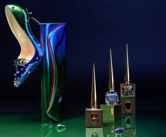 По версии Лубутена, скарабей должен быть не черным матовым, а радужным. Так, в лимитированной коллекции лаков появилось три металлических оттенка: бирюзовый с фиолетовыми вспышками, бронзовый с зелеными бликами и золотисто-розовый.