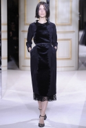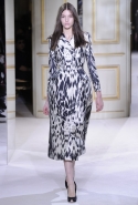 Обращение к своим корням — итальянской, а если быть совсем точными, римской моде — помогло Валли создать одну из самых органичных коллекций последнего времени, не обманув при этом ожиданий своей аудитории, по преимуществу молодой. Каким образом старая добрая черно-белая элегантность — анималистичный принт, черное strapless-платье из черной тафты, платье-футляр, запечатленные в образах итальянской киноклассики, — получили шанс зазвучать свежо и даже неожиданно? Как часто бывает в коллекциях Валли, выбор материалов и форма решают все. Платье-пальто с диким кошачьим принтом — первый выход показа — выполнено не из джерси или шелка, а из более плотного материала, благодаря чему оно лишено подчеркнутой чувственности. Монохромные плотные ткани заменены сочетанием прозрачной и "фоновой" ткани, которые как бы упакованы одна в другую. Игра текстур — плотных, мягких, прозрачных и матовых — придает классическим и консервативным силуэтам неожиданную геометричность, обтекаемость и трехмерность. А воротничок Peter Pan преображается благодаря неожиданному исполнению — из имитации крокодиловой кожи.