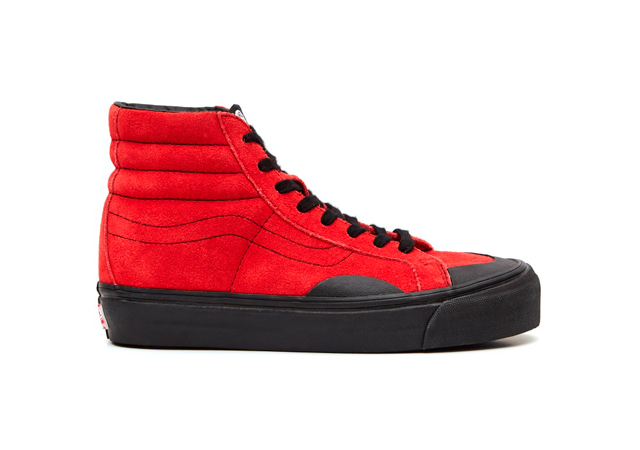 Если для летней коллекции Vans Рубчинский выпустил низкие кеды Old Skool и яркие парусиновые слипоны с принтами, то для осенней линии выбирает замшу и высокую шнуровку. В новой коллаборации Vans x Gosha Rubchinskiy всего одна модель Sk8-Hi с усиленным резиновым носком и боковыми панелями, зато представлена она сразу в трех цветах: черном, белом и красном.