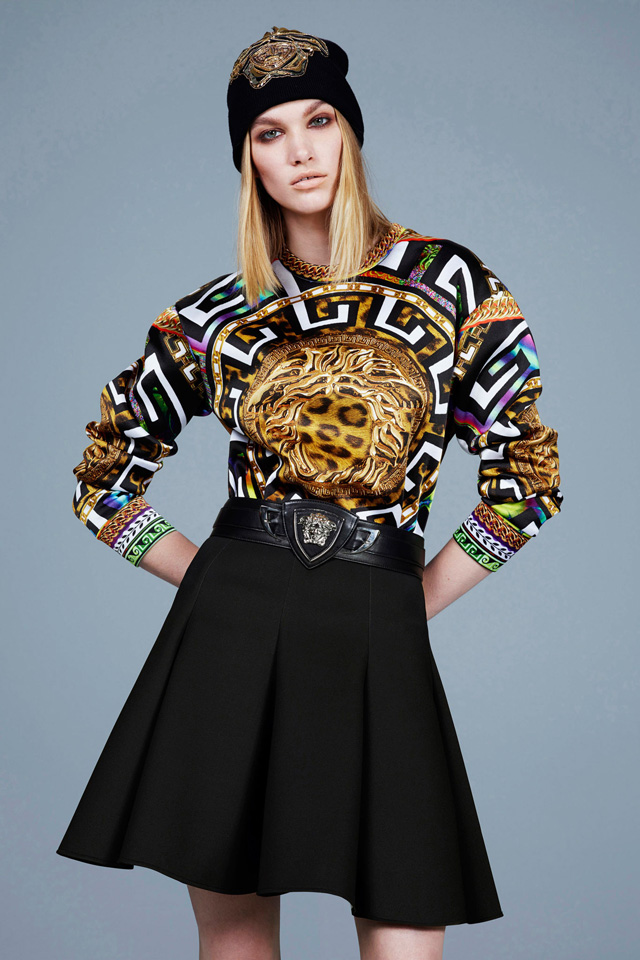 Кроме этих платьев в самом конце, все и вовсе достаточно строго: юбки-солнца по колено из темной ткани в рубчик, объемные пальто и кожаные куртки, принтованный свитшот с шапкой в тон. Такое ощущение, что это уже не Versace, а Versus, над которым в новом сезоне поработает певица M.I.A. А где же cама Донателла Версаче?