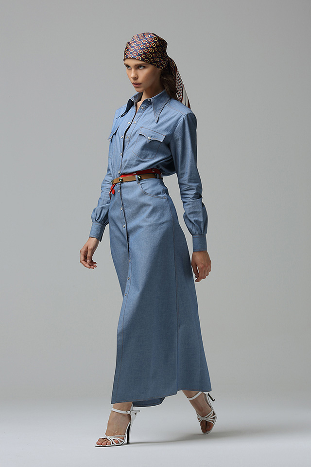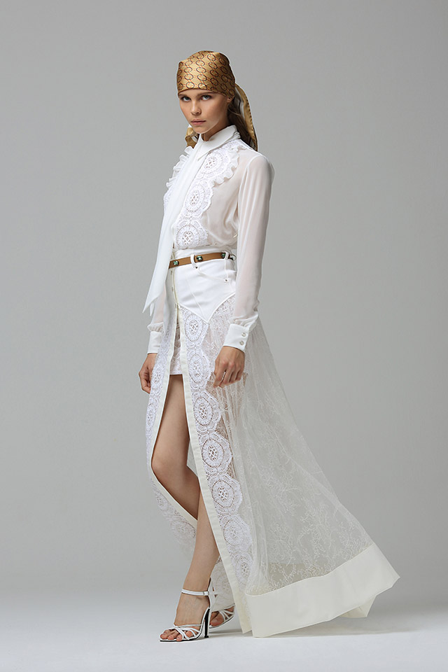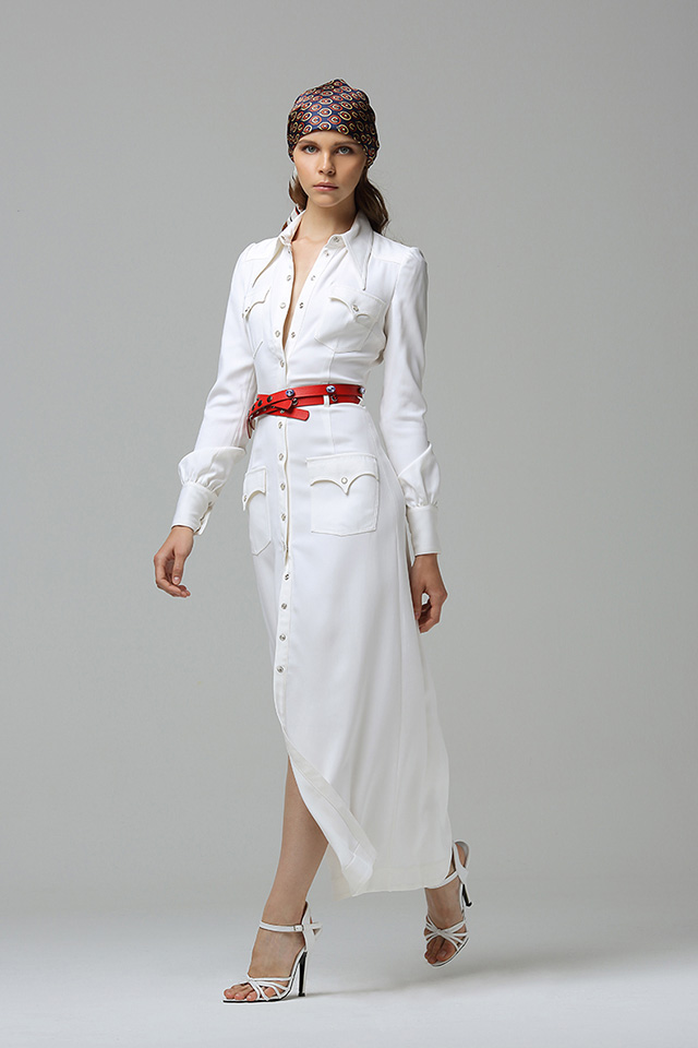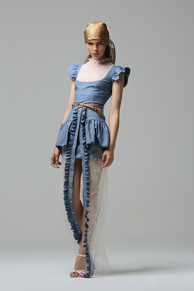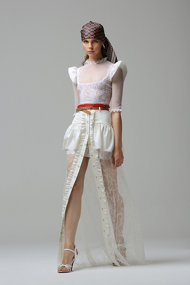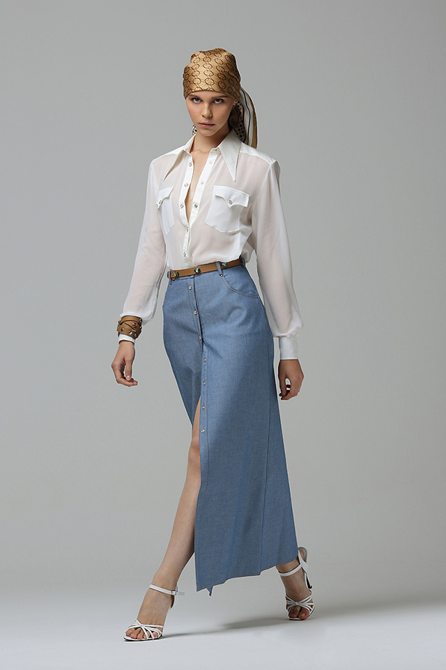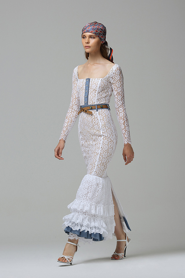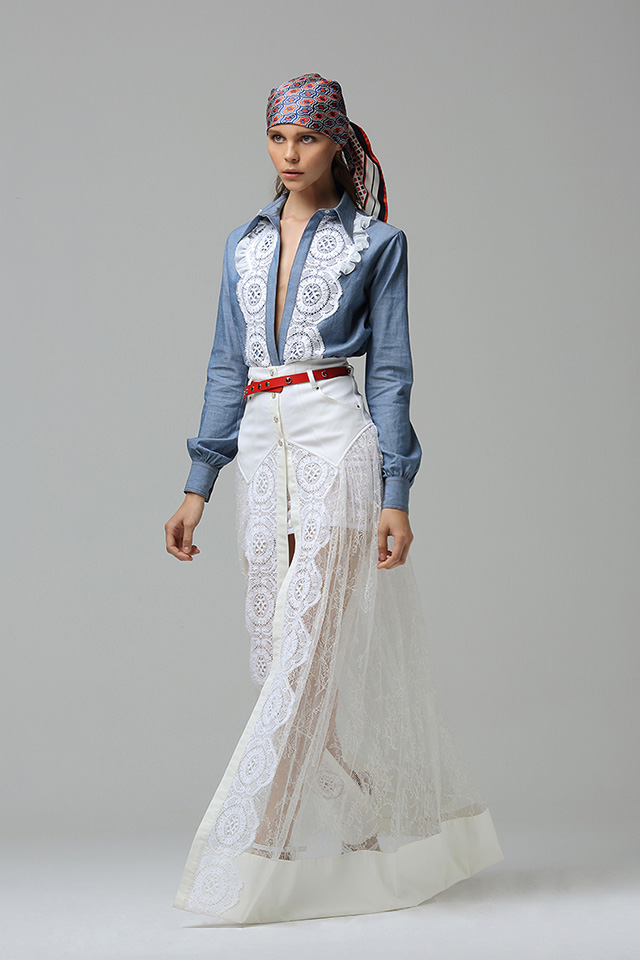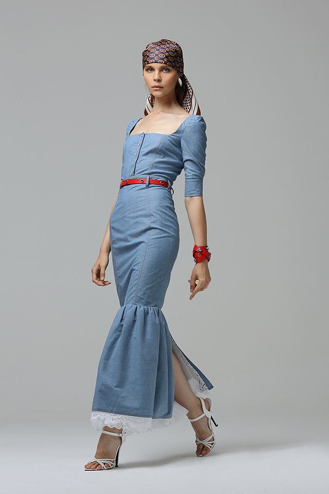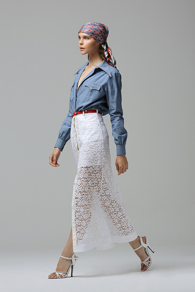 Визитной карточкой бренда Alessandra Rich стали роскошные платья, которые все чаще мелькают на героинях красных ковровых дорожек. Не обошлось без них, конечно, и в капсульной коллекции. Всего в капсуле Алессандры для Net-a-Porter 12 предметов, включая длинные юбки с вырезами, простые рубашки и платья-рубашки. А главной темой стало сочетание денима, который, впрочем, дизайнеру удается лишить традиционной для этого материала грубости, белого кружева и того же цвета летящей, полупрозрачной ткани. К каждому наряду прилагаются яркие ремни и узорчатые шелковые платки.