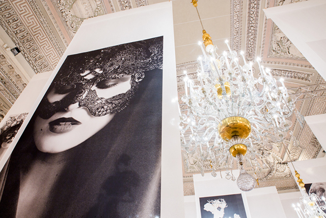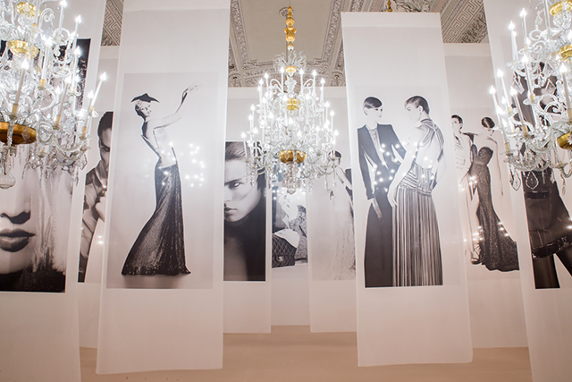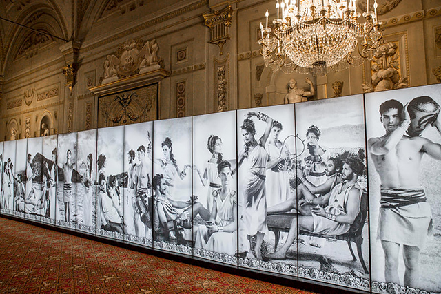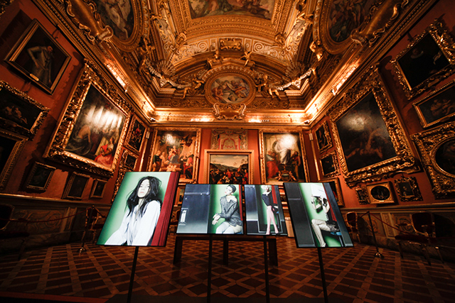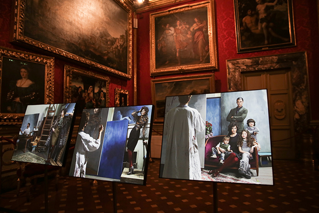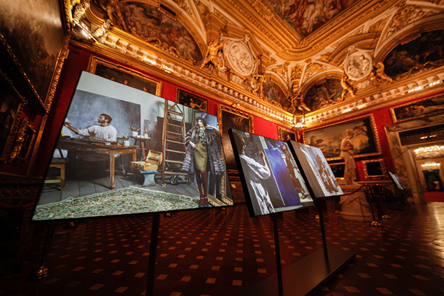 В залах, наполненных Рафаэлем (одно из лучших собраний в мире, выставлены 10 работ), Перуджино, Андреа дель Сарто, Россо Фьорентино, Веласкесом и Рубенсом, расставлены ярко подсвеченные кадры из фэшн-съемок Лагерфельда, а на одной из стен знаменитой Galleria Palatina палаццо Питти висит огромный фотопортрет самого Лагерфельда в разных ракурсах — натурально, рядом с Рафаэлем. В одном из последних ее залов, почти без картин, из кадров съемки 2013 года Le Voyage d'Ullise, где модели, обряженные в хитоны и набедренные повязки, изображают гомеровских богов и героев, составлено панно. В Sala Bianca с потолка свисают огромные полотнища с напечатанными на них фото, среди которых, как среди декораций, на открытии делали селфи русские девушки в платьях в пол и итальянские парни в парчовых костюмах. В Sale degli Arazzi — опять античные боги и герои во всю стену, как гобелены, под аккомпанемент немецкой речи.