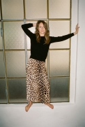 Но черные, бежевые и серые уютные образы разбавлены неожиданными элементами — в первую очередь, яркими платьями с принтами. На этот раз главным принтом коллекции стал рисунок со снегирями в трех расцветках: желтые птички на черном фоне, синие — на красном и красные — на голубом. Также Александр Терехов впервые включил в коллекцию вещи из денима: несколько пар джинсов, куртку, юбку и даже платья и парку.