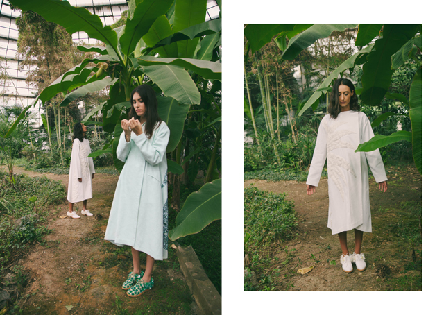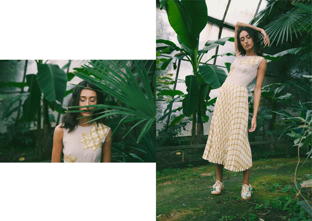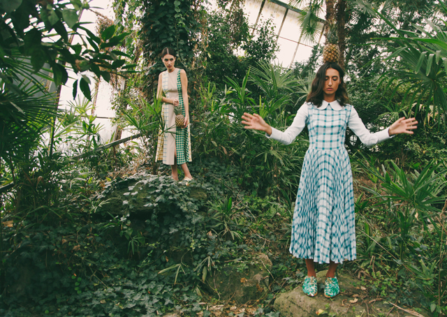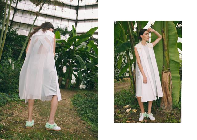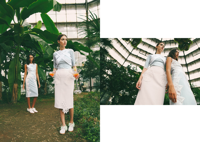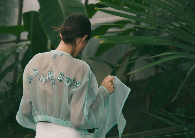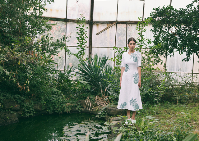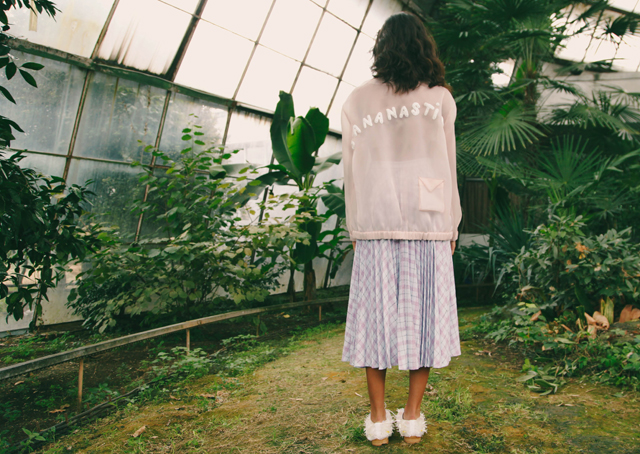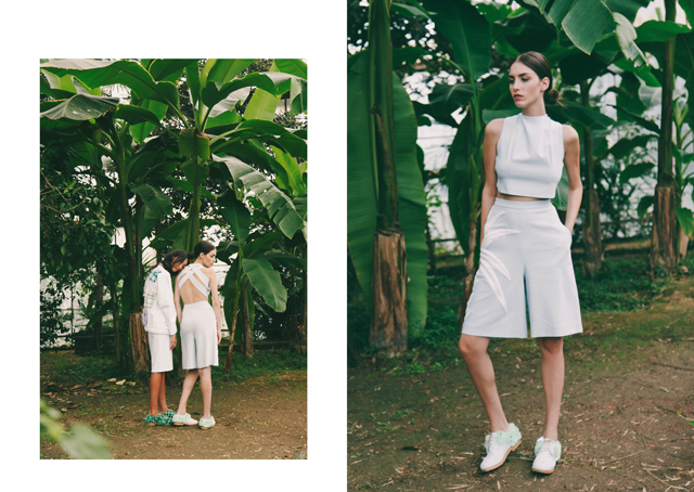 Кроме пестрой тропической гаммы не обнаружили мы в коллекции и опасностей, которые, как известно, прячутся в зеленых зарослях: никаких представителей фауны здесь нет. Есть только ананасы, связки бананов и пальмовые листья, но и те не в своих естественных, а в приглушенных цветах: нежно-мятном и даже бежевом. Эти мерцающие фигурные детальки, нашитые то поверх скрытых карманов, то просто во всю спину, то аккуратно, как маленькие заплатки, блестящие на локтях, действительно оживляют довольно сдержанную коллекцию, полную закрытых и спокойных вещей.