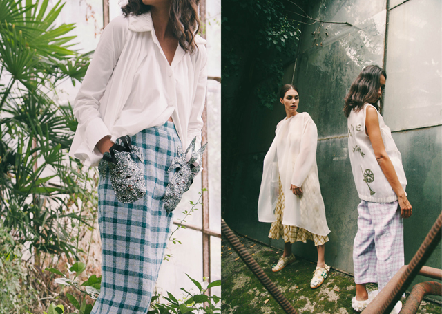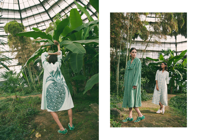 Единственным относительно ярким акцентом становится зеленая клетка. Она тоже не спорит с общей нейтральной цветовой гаммой, а как-то очень деликатно ее дополняет. В итоге по-настоящему летнего ощущения, как и тропического, эта коллекция Anouki не дает — вспоминается, несмотря на ананасы, скорее ранняя весна. Да и вещи, представленные в лукбуке, больше подходят как раз для весенней поры: вряд ли в жарких тропиках вам пригодятся джемперы, длинные юбки или, например, клетчатый брючный костюм.