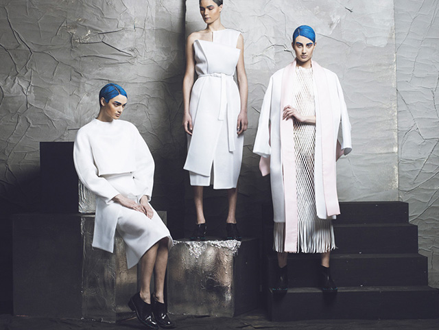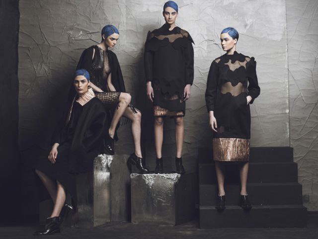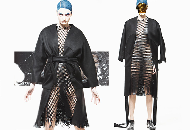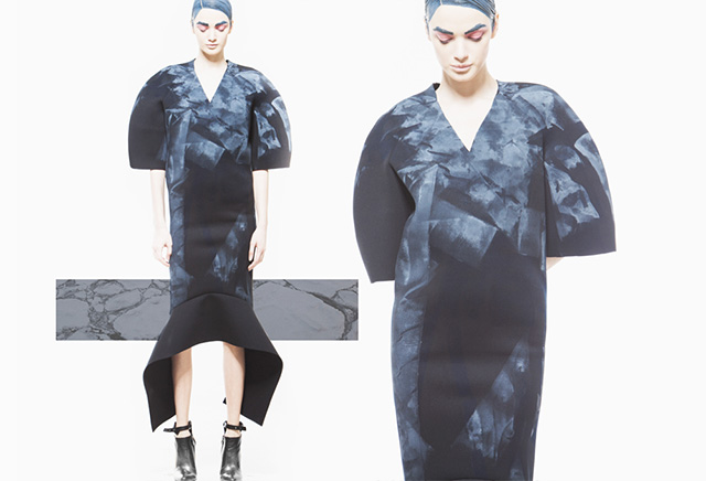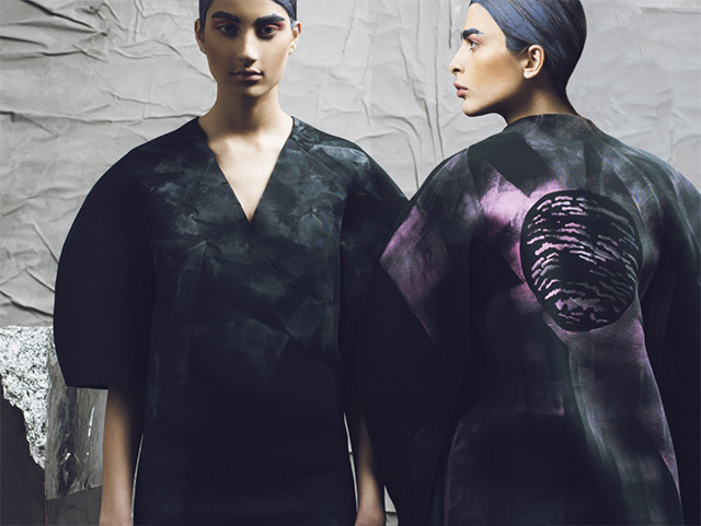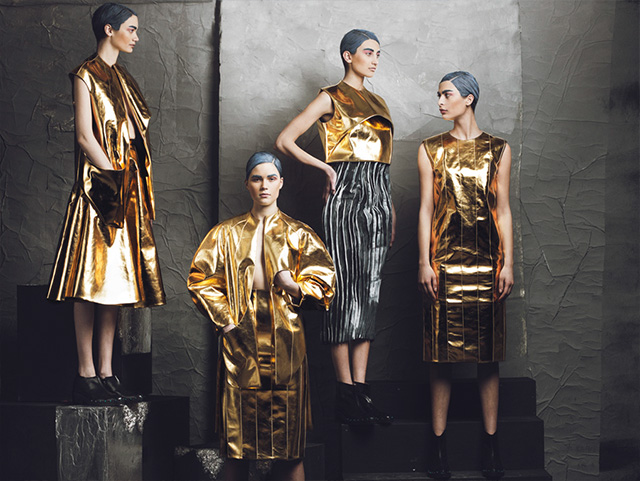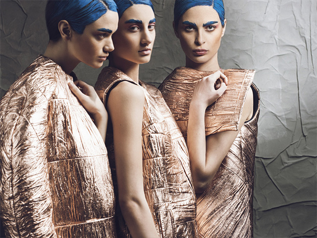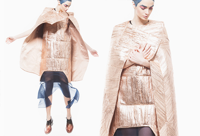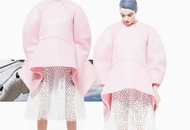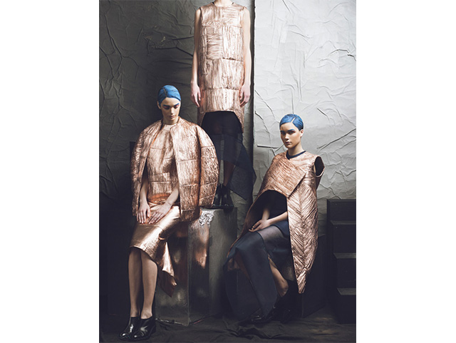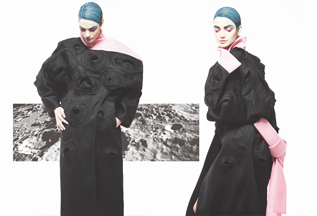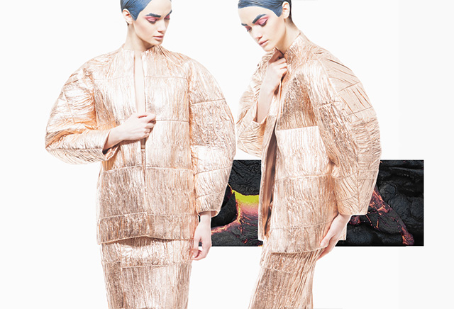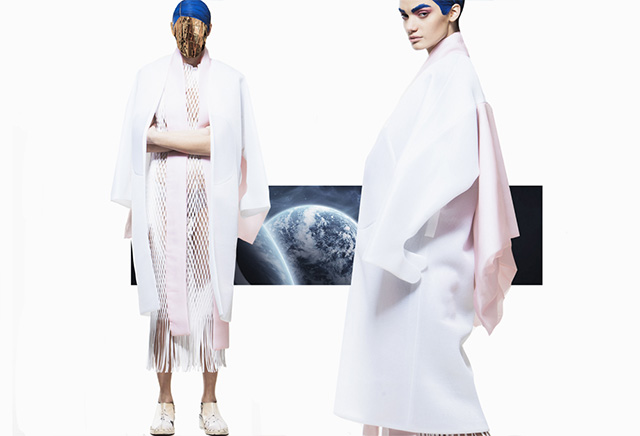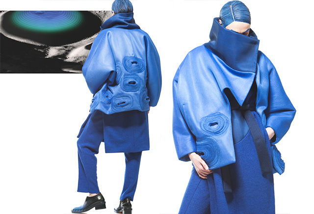 Свое значение имеет и каждый использованный в коллекции цвет. Синий, например, изображает сам космос, костюмы медного цвета, драпированные вручную, напоминают расплавленный металл или извержение вулкана. А перфорация на белых кожаных вещах символизирует звезды.