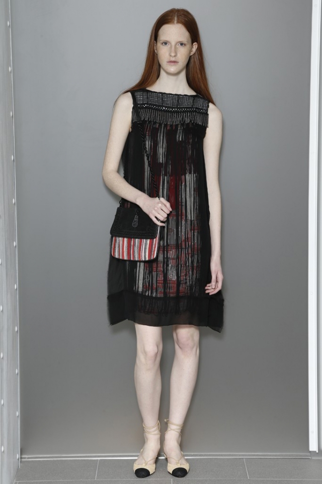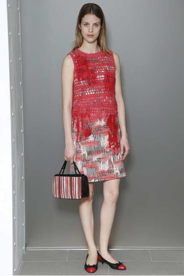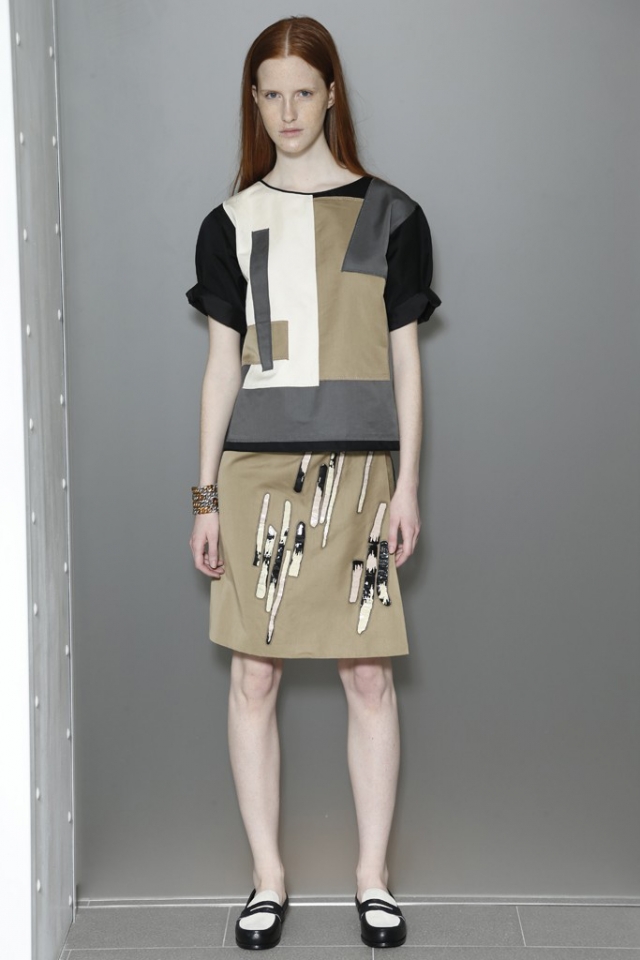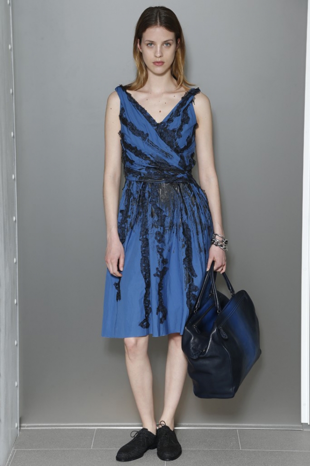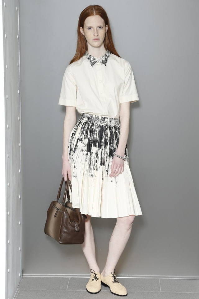 Кроме женственных платьев, которые у Bottega Veneta присутствуют всегда, в коллекции resort 2014 появилась шелковая рубаха с короткими шортами — в стиле спортивно-аскетичного шика, с аппликацией в виде геометрических фигур. Благодаря черным и золотым прямоугольникам этот костюм не выбился из коллекции, в которой платья и юбки хаотично отделаны вышивкой и макраме в духе супрематизма.