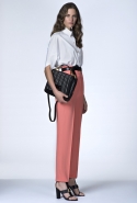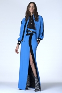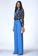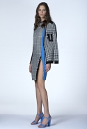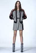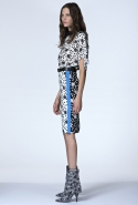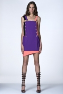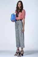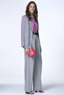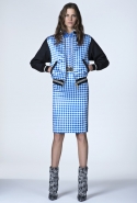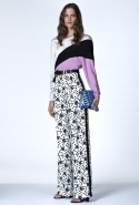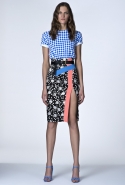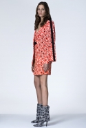 В ней не обошлось без любимого цветового сочетания дизайнера — небесно-синего с кораллово-розовым, черным и белым. Вокруг этих четырех цветов построена вся коллекция: вот по платью с запахом проходят толстые полосы розового и черного цветов, разрез юбки в черно-белый рисунок очерчен розовым и синим, а на розовой ткани рассыпан черный и белых горох.