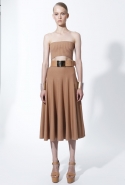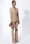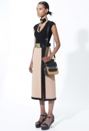 Наш фаворит — образ №10 с бежевой юбка А-силуэта на пуговицах спереди, подпоясанной широким питоновым ремнем, белой рубашкой с накладными карманам, босоножками из кожи питона на высокой танкетке и кулоном в виде клыка на длинной золотистой цепочке.
