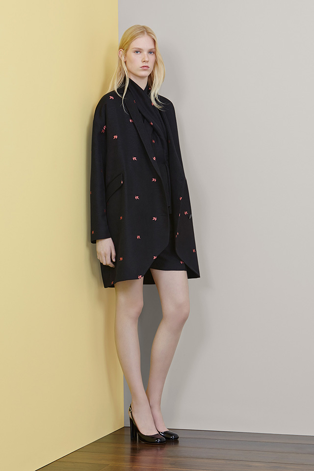 Хотя поиски креативного директора в Mulberry все еще продолжаются, цены на продукцию приходится понижать, а не так давно дом остался и без генерального директора, будущее марки почему-то не вызывает печальных сомнений — пока у них есть такая дизайнерская команда, все точно должно быть хорошо. Предыдущая межсезонная коллекция pre-fall 2014, ставшая первой выпущенной без чуткого руководства Эммы Хилл, уже задала высокую планку и дала поклонникам марки большую надежду. И хотя основным цветом тогда стал серый, даже его дизайнерской команде дома удалось сделать игривым и женственным. В этот раз они взялись за пастельные цвета — приглушенный цвет яичного желтка, очень красивый серо-голубой, белый и немного кораллового, которые разбивают несколько темно-синих вещей с коралловыми же крапинками. Получилось будто бы незамысловато, но очень приятно: к простым силуэтам дизайнеры добавили неожиданные и очаровательные детали вроде собирающихся из складок бантиков, идущих по заниженной и вообще весьма условной линии талии оборок и полупрозрачных сеток поверх и без того воздушных платьев.