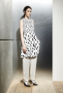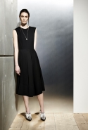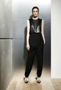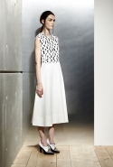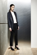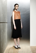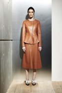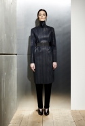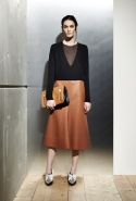 Такие костюмы — черные, в полоску — стали отправной точкой всей коллекции. Вдохновение Грация Малаголи черпала из работ Рона Джуда, который в 90-е снимал американских бизнесменов с Уолл-Стрит. Вот откуда в коллекции строгие силуэты и жесткие материалы — например, блестящая черная или рыжая кожа. Деловыми получились даже платья — черное, длиной до колена, с четкой линией талии или белое с асимметричным подолом.