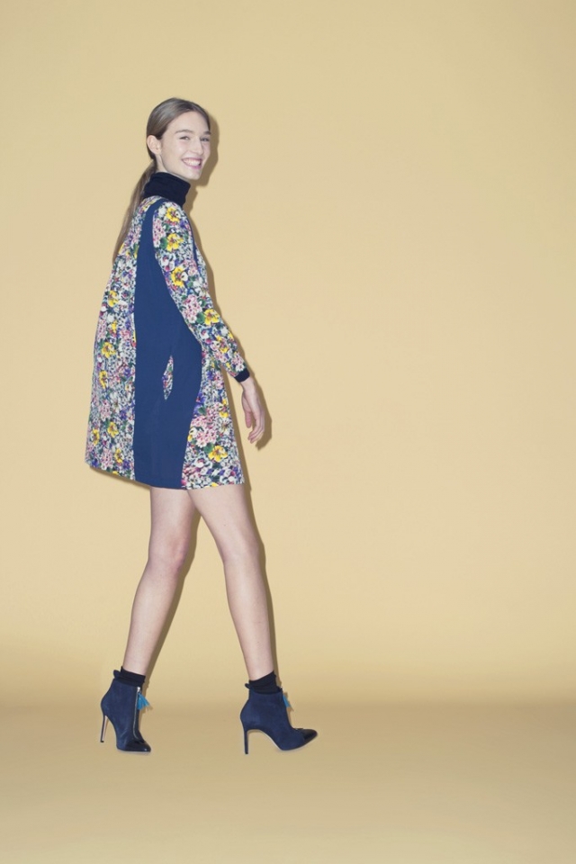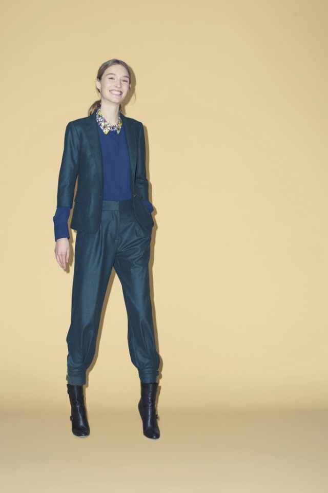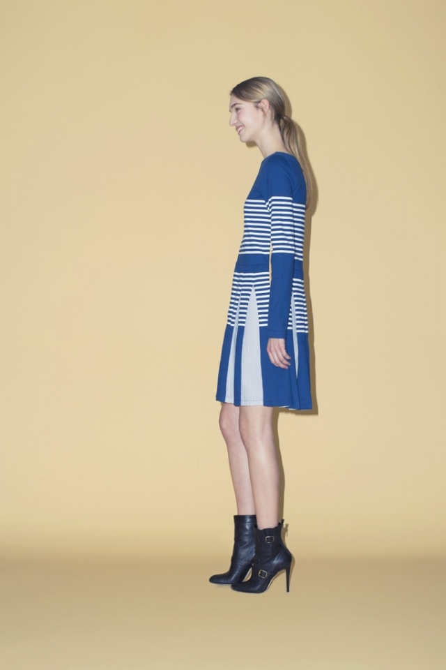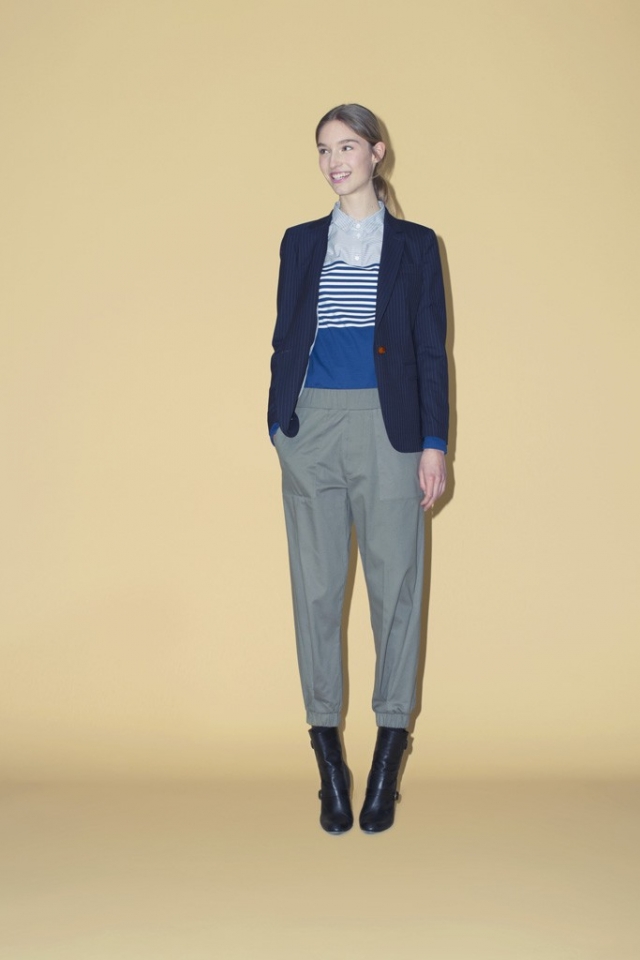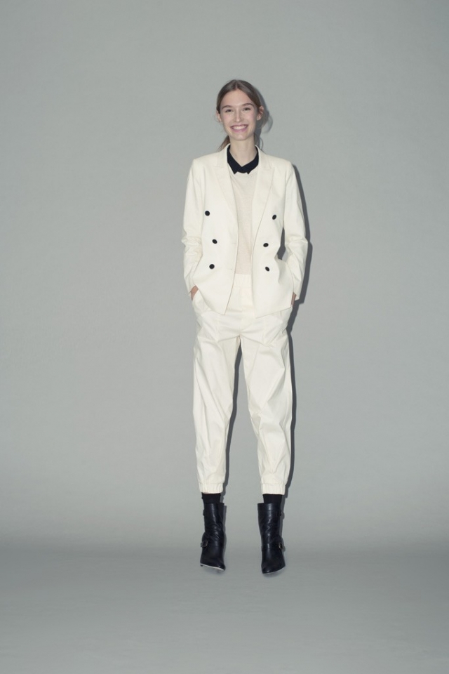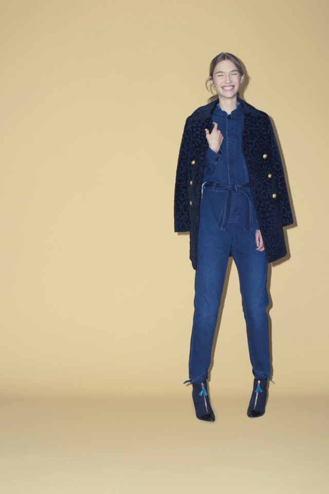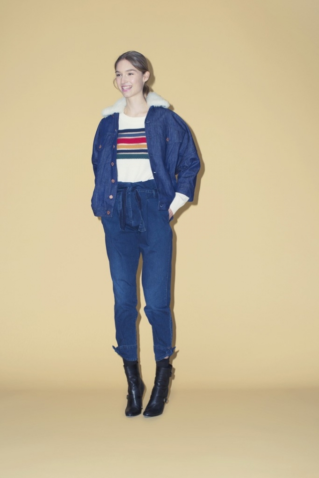 А главной звездой коллекции стал джинсовый костюм — ярко-синего цвета, надетый с жизнерадостной полосатой водолазкой. Джинсы на талии с пояском-бантом, внизу — джинсовые отвороты, как на рукавах накрахмаленных рубашек, объемная куртка с пушистым белым воротником.
