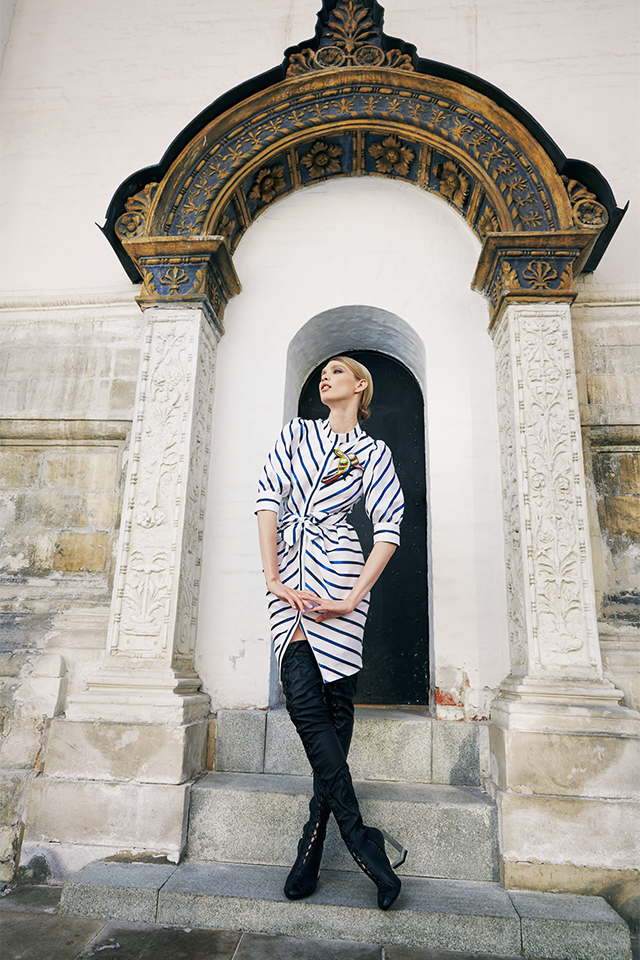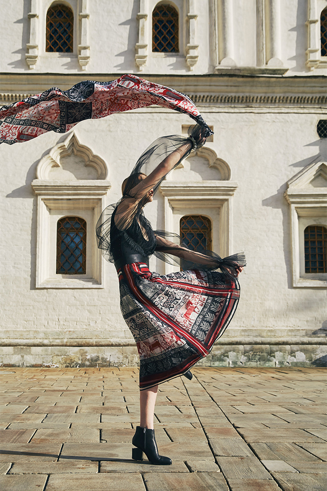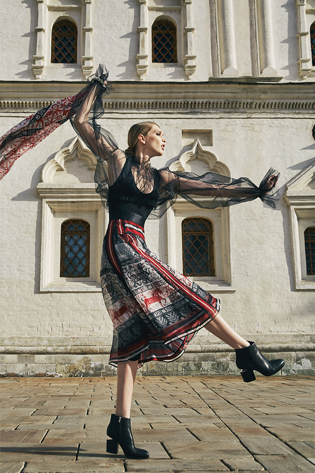 В съемке, главной героиней которой стала модель Ирина Николаева, сказочные образы Алены Ахмадуллиной соседствовали с модернизмом Viva Vox, униформа от A la Russe с фольклорными мотивами Gourgi, утонченность Александра Терехова с советской романтикой Светланы Тегин.